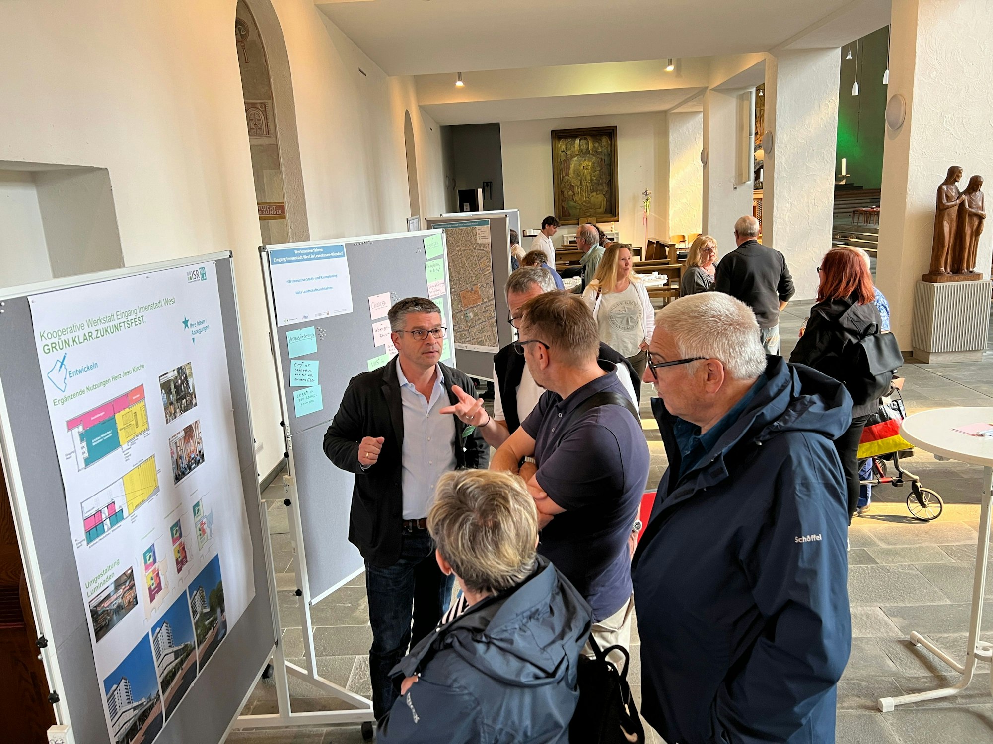 Wenn es nach den unabhängigen Stadtplanern geht, ist die Richtung klar, welche Kur die richtige für Wiesdorfs Westen wäre: mehr Grün, Gastronomie, Gelegenheiten zum Treffen. Drei von der Stadt Leverkusen engagierte Stadtplanungsbüros stellten ihre Ideen bei einer Zwischenpräsentation im Werkstattverfahren „Eingang Innenstadt West“ in der Kirche Herz Jesu vor. Dieser kleine öffentliche Wettbewerb ist notwendig, denn sonst gibt es keine Städtebauförderung. Es geht um die Zukunft des Kirchengebäudes selbst und um das Gemeindehaus und die Pavillons; zu groß sind Kirche und Nebengebäude inzwischen – unbezahlbar für die Gemeinde.