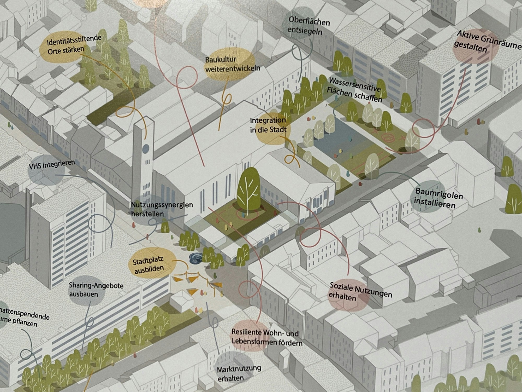 Das Büro will die Pavillons abbrechen, die anderen möchten sie im Sinne der CO₂-Einsparung nur umbauen, durchgängig machen. Für alle Planungsbüros steht fest, dass die Volkshochschule irgendwo ins Herz-Jesu-Viertel umziehen soll.