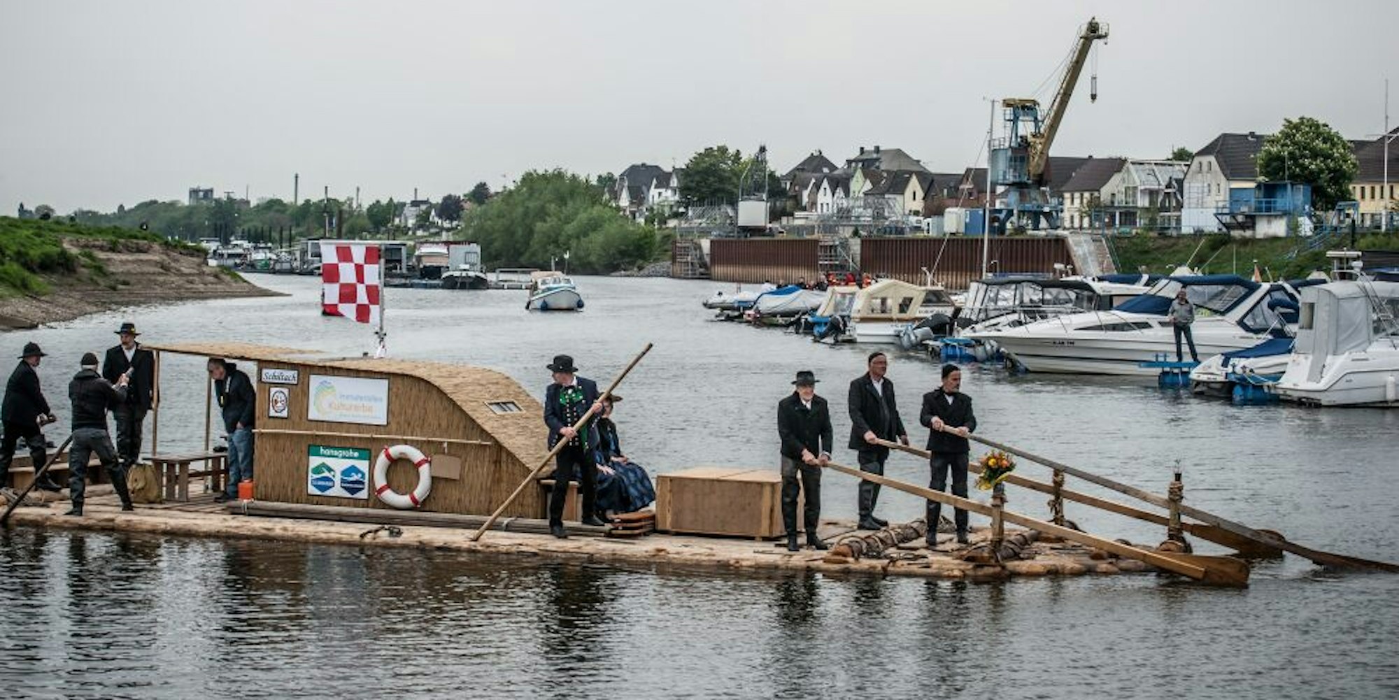 Wie in früheren Jahrhunderten, als Holz aus dem Schwarzwald in Hitdorf anlandete, fuhr das Floß in den Hafen ein.