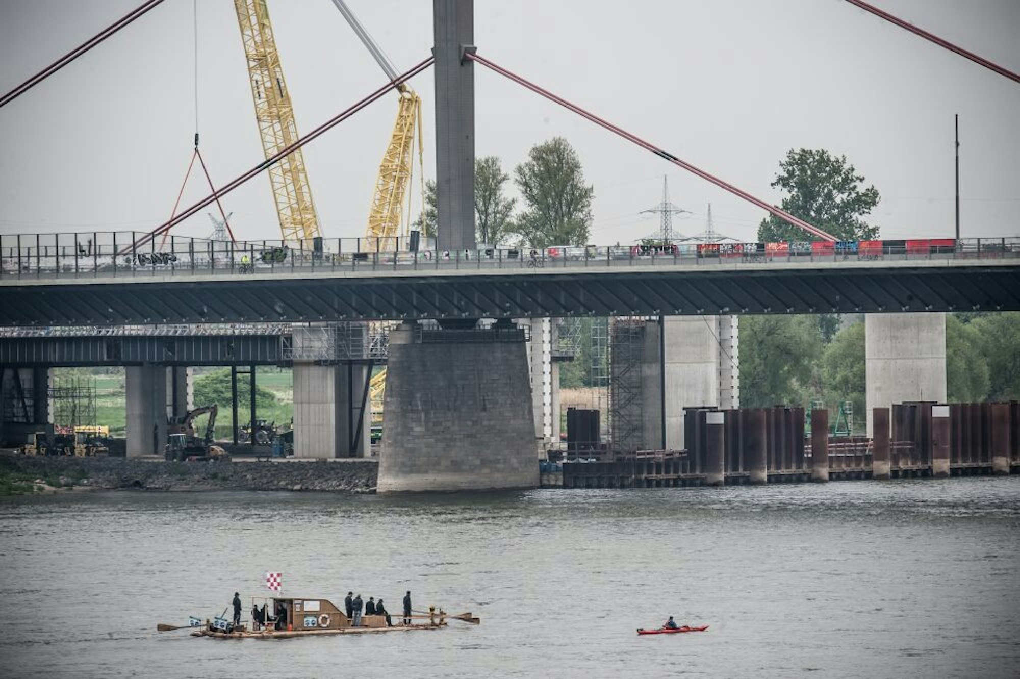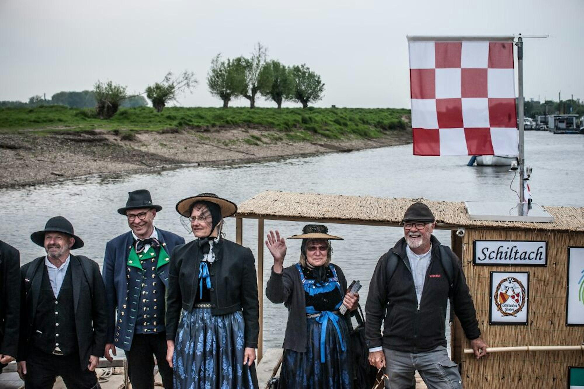 Leverkusen – Voll ist es am Freitagnachmittag am Rheinufer entlang des Hitdorfer Yachthafens. Rund 300 erwartungsvolle Menschen starren den Rhein hinauf. Viele haben Kameras, Ferngläser und sogar Drohnen dabei, als in der Ferne ein altertümliches Floß wie aus dem Bilderbuch auftaucht und immer größer wird.