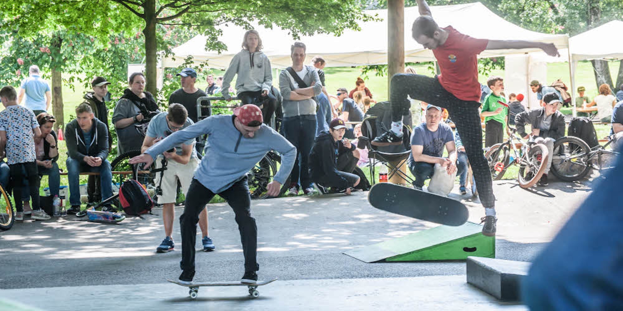 Der jüngste Teilnehmer stellte sich schon mit acht Jahren den Wertungen der kritischen Jury sachkundiger Kinder und Jugendlicher, die coolen älteren Teilnehmer nahmen die Strecke auf rotierenden Brettern und halsbrecherisch abhebenden Rädern – Sanitäter standen in Rufweite bereit – mit unerschütterlicher Lässigkeit.