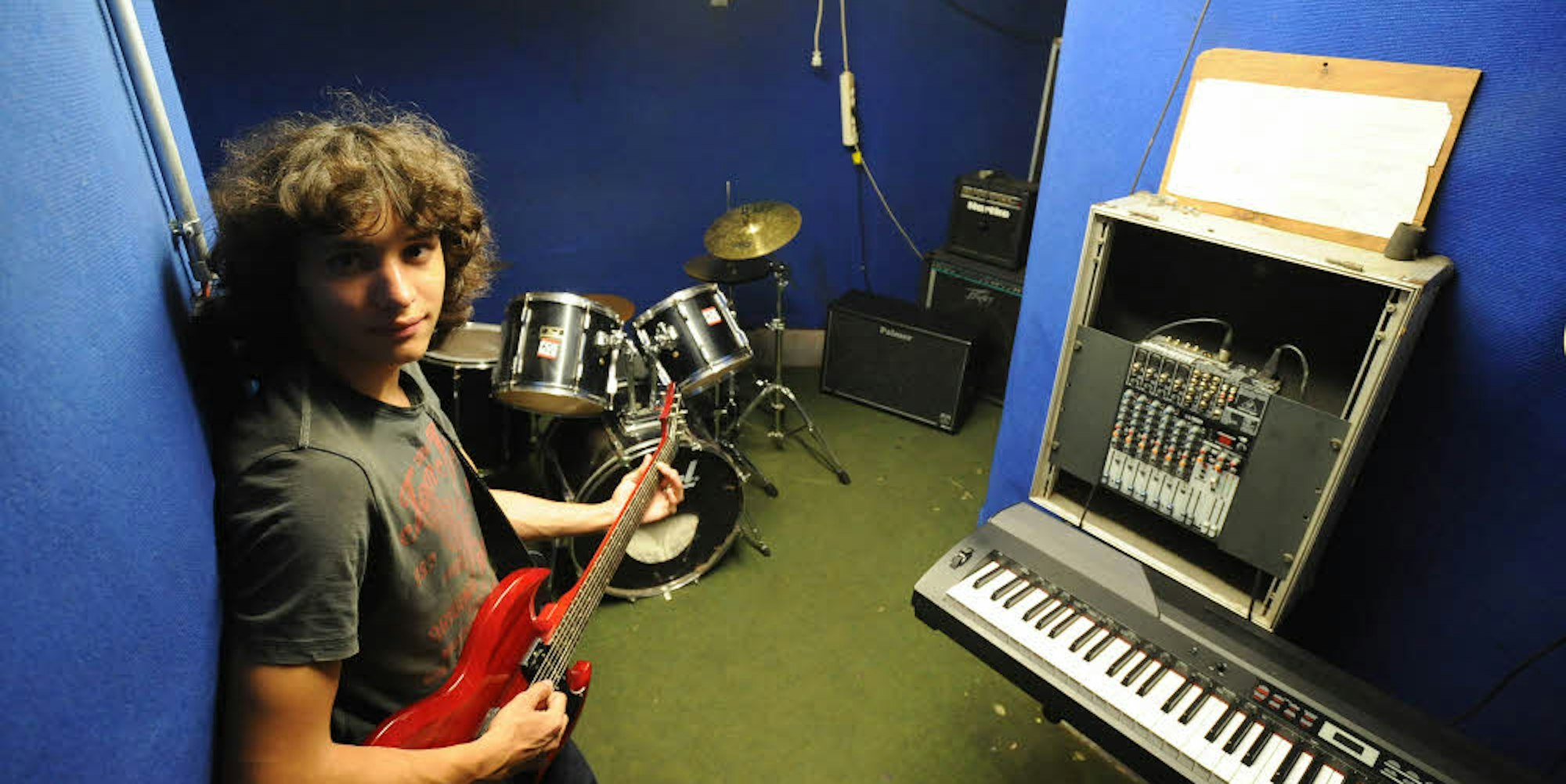 Jetzt steht ein Schlagzeug und ein Keyboard darin und es gibt Anschlüsse für E-Gitarren, wie Karim Reck sie spielt. Im Alter von neun Jahren kam der heute 18-Jährige zum ersten Mal in das Jugendzentrum und war direkt begeistert von den Älteren, die dort unter der Anleitung von Hilken Gitarre spielen übten. „Ich wollte das auch unbedingt lernen und habe mir schon nach einem halben Jahr eine Gitarre gekauft, so ein Billigteil aus dem Musikstore.“