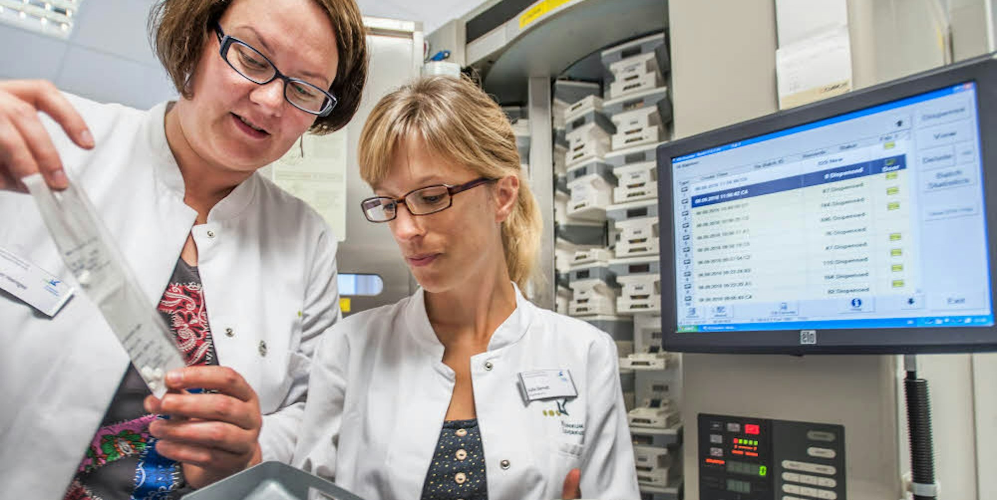 Annegret Heintges, Leitende Apothekerin im Klinikum, und Apothekerin Julia Berndt, zeigen, wie „Hermann“ die Tabletten in je ein Tütchen pro Gabe verpackt und beschriftet.