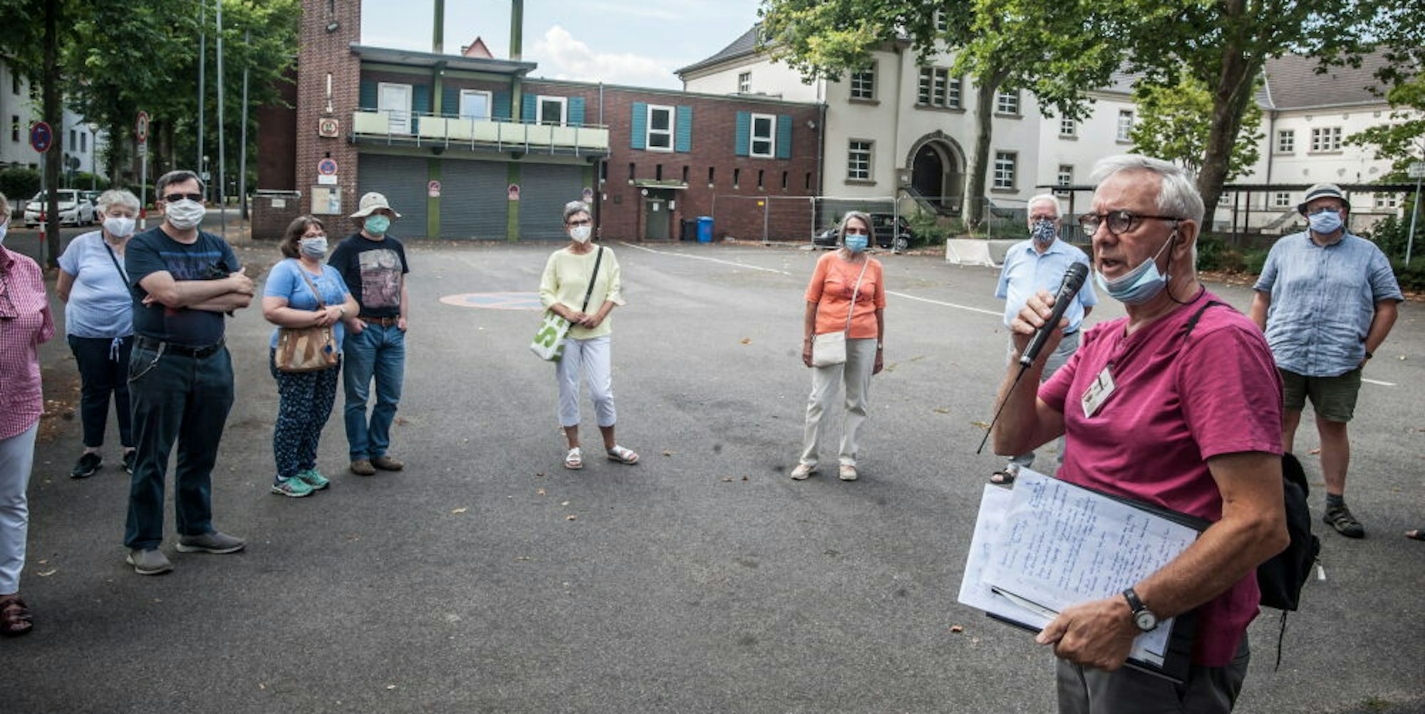 Das Teamwork der beiden klappt an diesem Tag bei der Tour durchs Viertel sehr gut. Scholten trägt den Lautsprecher, aus dem Odenthals Stimme kommt – manchmal drehen sich die Köpfe des Publikums amüsiert hin und her, wenn Odenthal auf der einen, seine Stimme auf der anderen Seite der Gruppe ist. „Ich will Sie nicht mit historischen Fakten und Zahlen überschütten“, verkündet er, „nur ein bisschen was zu den Orten erläutern, an denen man so immer vorbeigeht.“ Gleich am Bahnhof erzählt Odenthal von der Abstimmung der Bürriger und der Küppersteger; davon, wie knapp die Namenswahl auf „Bahnhof Küppersteg“ fiel. Davor waren Bürrig und Küppersteg noch eine Gemeinde, die von der Sprengstofffabrik und den Ziegeleien lebte.