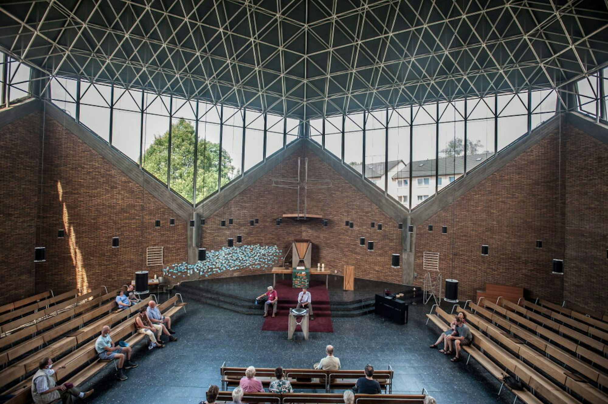 Nach den ursprünglich angesetzten anderthalb Stunden ist die Führung noch lange nicht beendet, doch eine Pause in der Petruskirche lädt zum Verweilen ein. Hier wird klar, wie schnell eine Schweigeminute unter dem Fischernetz der Decke vergehen kann. Die großen Dreiecksfenster zeigen den Himmel. „Und nicht nur das, es ist auch eine Offenheit zur Welt“, erklärt Pfarrer Scholten. „Wir sind eine Stadt mit unheimlich viel Herz und was zu gucken“, so formuliert es Odenthal. „Und jeder der Stadtteile ist eine Blume in einem schönen Strauß.“