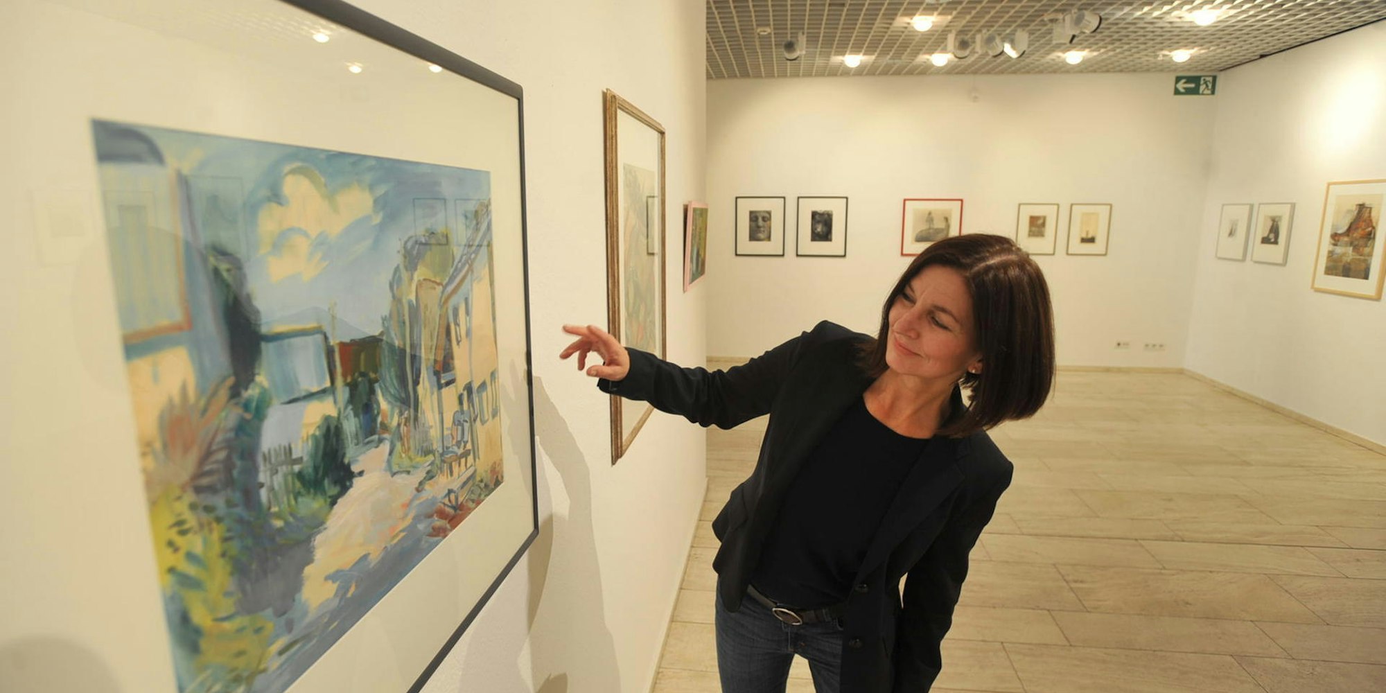 Kuratorin Andrea Peters, hier vor Kurt Lorenz’ „Dorfstraße in der Eifel“, suchte die Arbeiten für die Auktion aus.