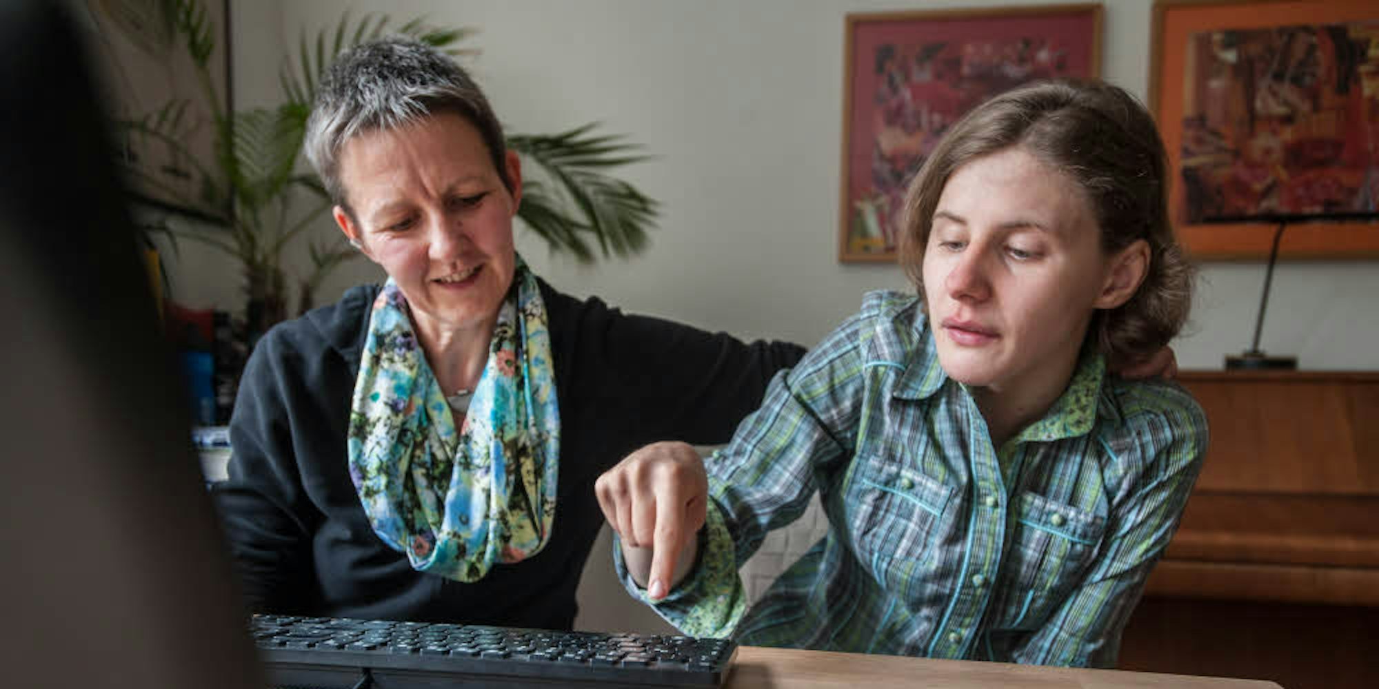 Brigitta Kollbach stabilisiert mit einem Arm auf der Schulter den Körper ihrer Tochter Pia beim Schreiben.
