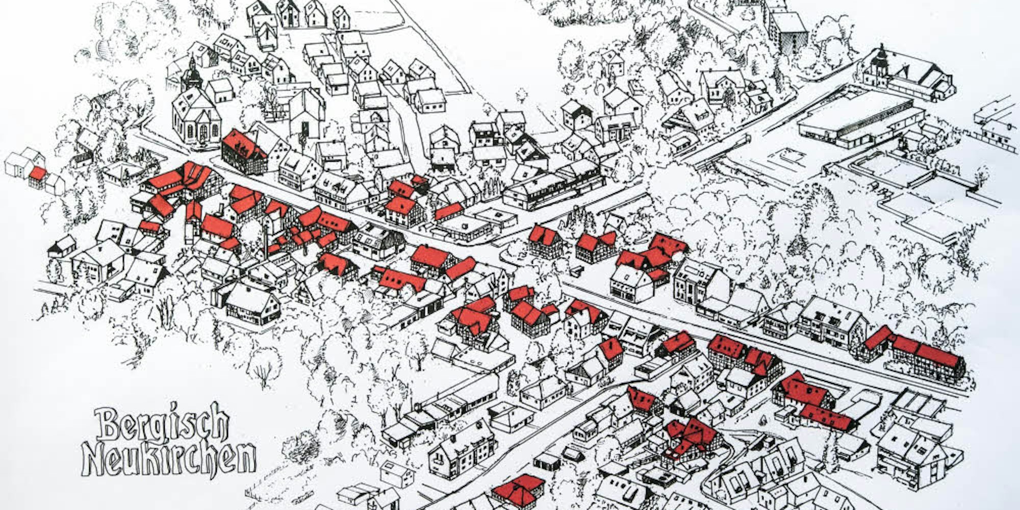 Eine Luftbild-Zeichnung vom Hauptort Bergisch Neukirchen, bei der alle Fachwerkhäuser mit roten Dächern markiert wurden