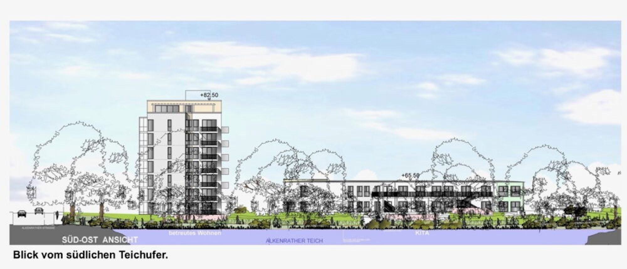 So werden Hochhaus und Kita mit Ansichts von der Seeseite aus dargestellt.