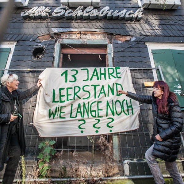Leverkusen – Jetzt soll es aber wirklich bald losgehen: Mit ein paar symbolischen Hammerschlägen haben Oberbürgermeister Uwe Richrath und der Bergisch Gladbacher Bauer Johannes Krämer demonstriert, dass es ernst wird mit dem Abbruch der Brandruine Alt Schlebusch an der Bergischen Landstraße. Das einstmals beliebte Lokal wurde 2003 wegen nachgewiesener Brandstiftung stark beschädigt. Niemand renovierte es, so dass das Gebäude verfiel. Krämer kaufte es und jahrelang wurde über „den Schandfleck“ in der Fußgängerzone in Schlebusch gestritten und gefeilscht.