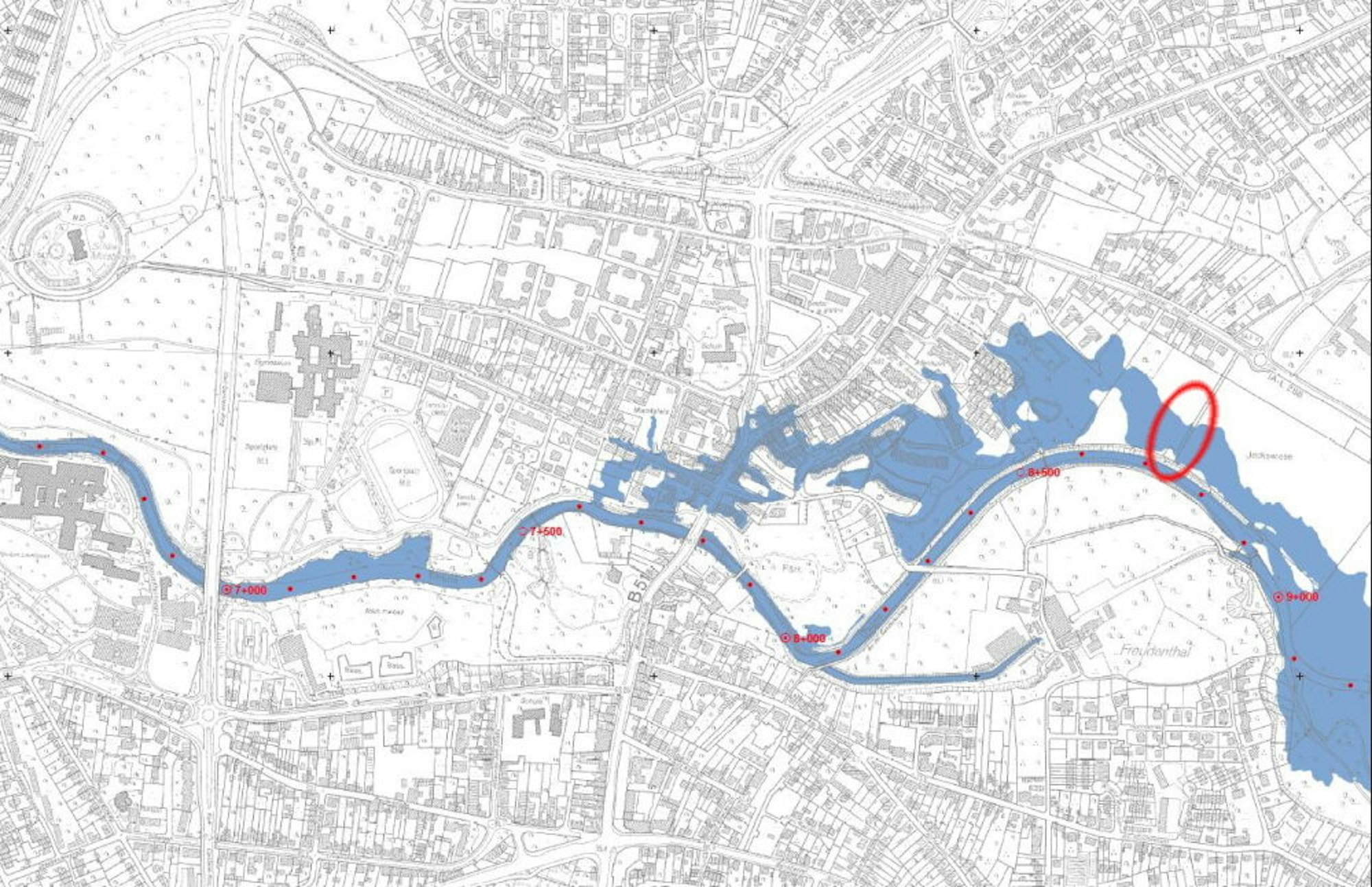 An der mit einem roten Oval markierten Stelle soll der zusätzliche Dhünndeich errichtet werden.