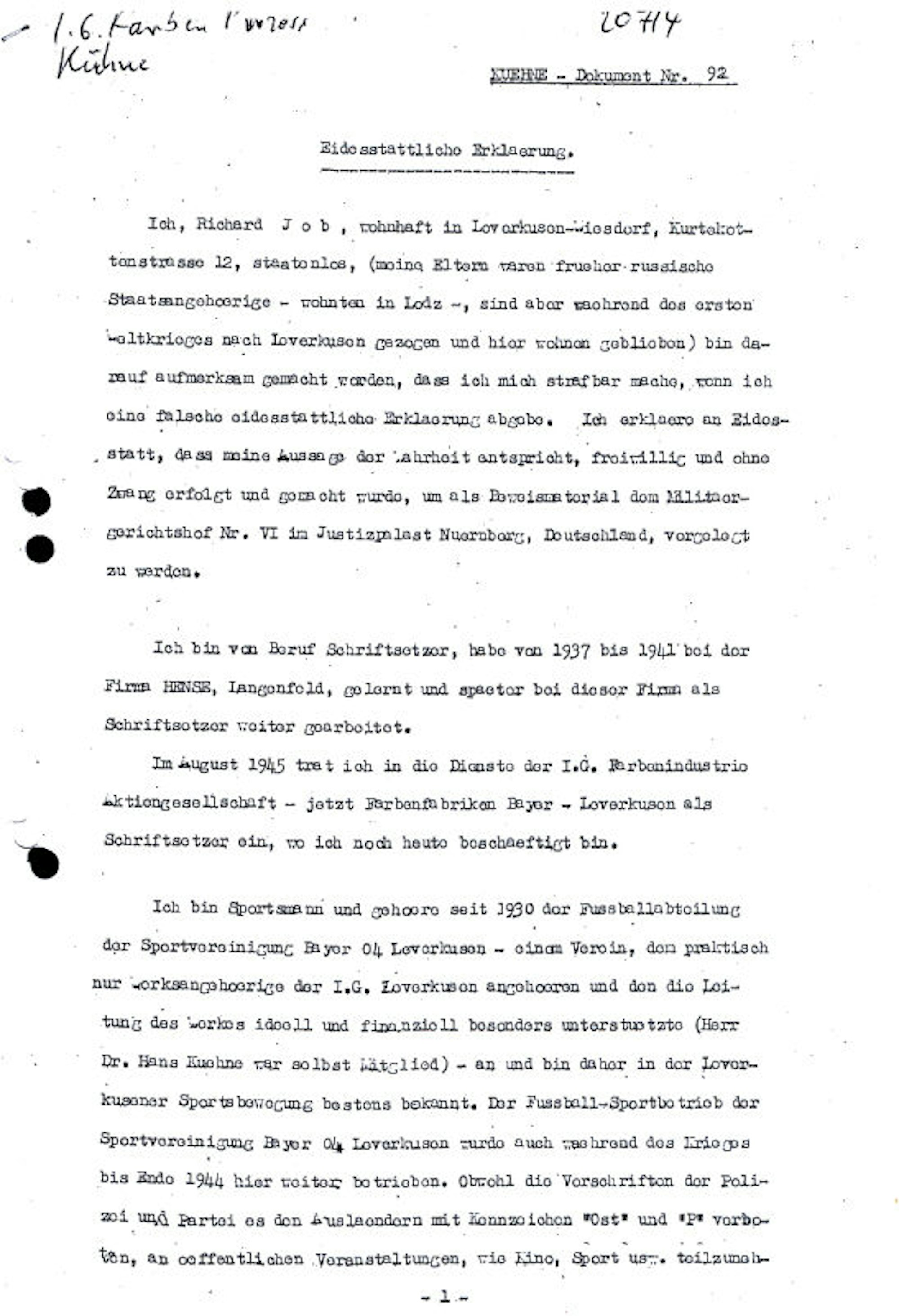 Manches ist in den Archiven verschwunden, wie auch drei Schreibmaschinenseiten, auf denen der Leverkusener Fußballer Richard Job zur Entlastung des ehemaligen Bayer-Werkschefs Hans Kühne im Nürnberger Prozess gegen die I. G. Farben seine eidesstattliche Aussage unterschrieben hatte. Kühne war 1947 von der US-Militärregierung verhaftet und 1948 in Nürnberg wegen Plünderei angeklagt worden.