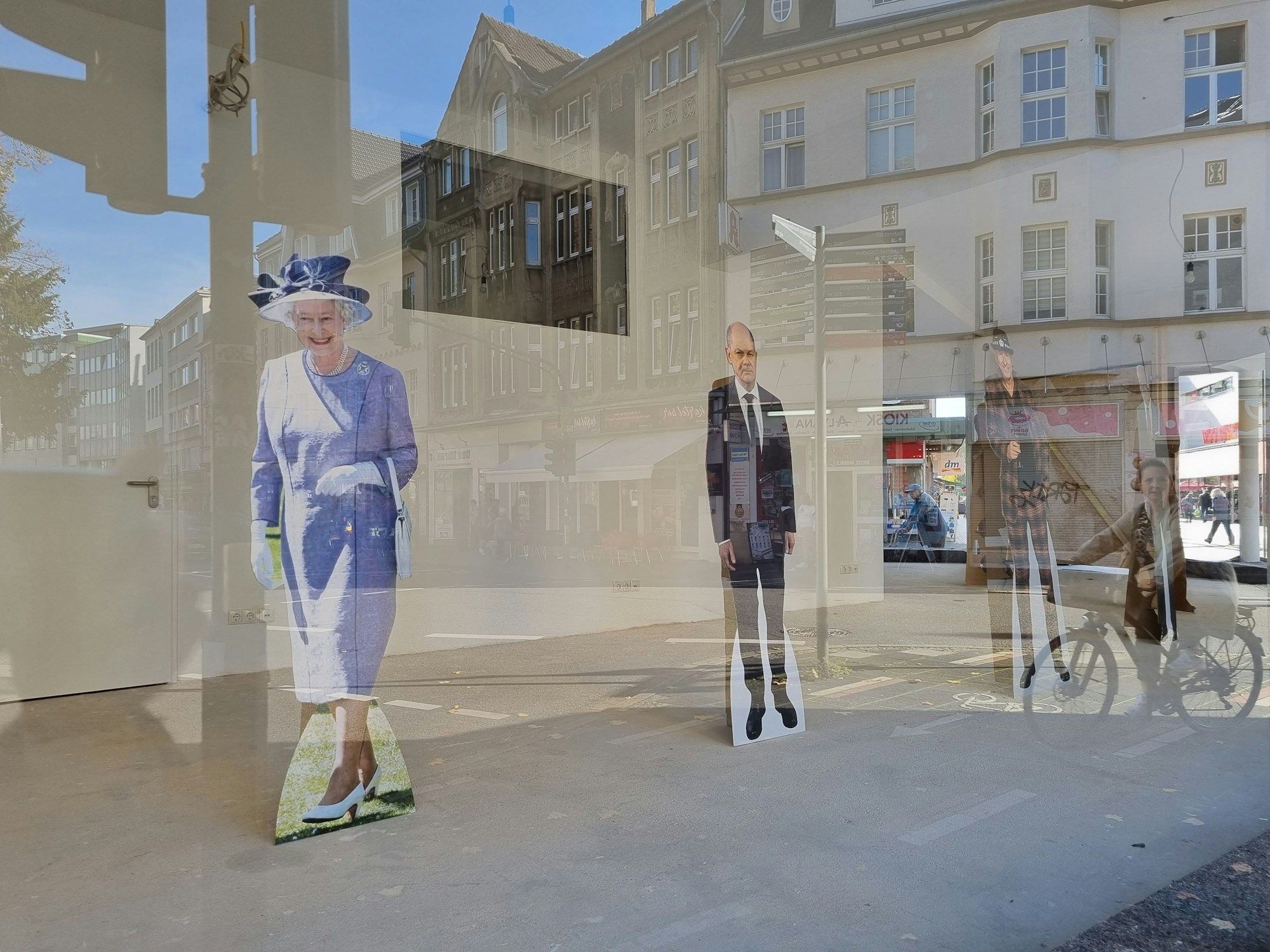 Leverkusen – Wer an den Schaufenstern des ehemaligen Schreibwarengeschäfts Paffrath an der Gerichtsstraße vorbeikommt, wird freundlich gegrüßt. Nicht von irgendwem: von der kürzlich verstorbenen Queen Elizabeth II., US-Präsident Joe Biden, Entertainer Thomas Gottschalk oder 80er-Jahre-Fernsehstar David Hasselhoff.