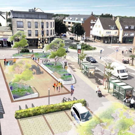 Auf dem Rheindorfer Platz selbst wird es am Rande nur zwei Behindertenparkplätze und einen Taxi-Platz geben. Die übrige Gestaltung mit Pflanzbeeten, Holzbänken, Brunnenanlage, einem Quartierstisch und WLAN-Hotspot ist unverändert geblieben.
