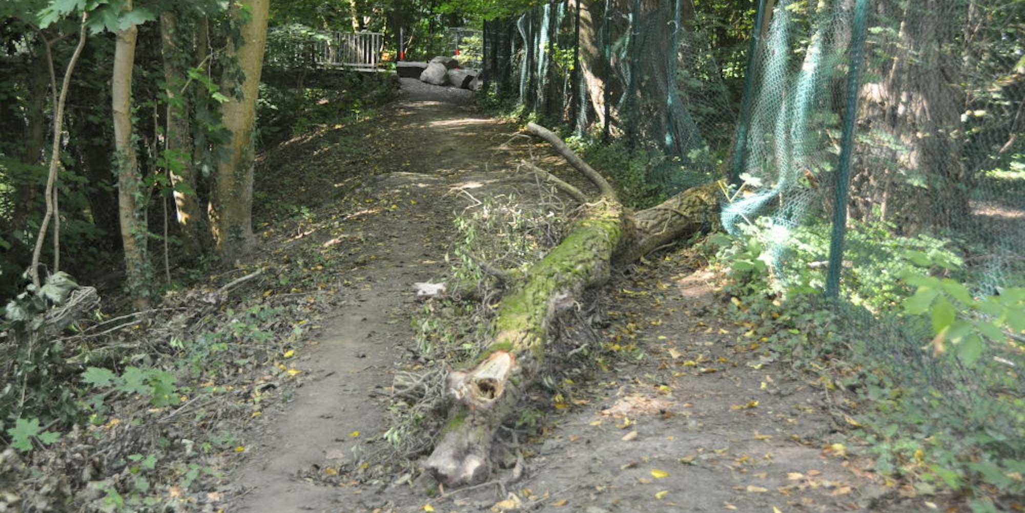 Leverkusen – Ende vergangener Woche ist ein rund 30 Zentimeter dicker Ast in einer Baumkrone abgebrochen und aus zehn Metern Höhe auf den gesperrten Weg entlang der Dhünn in Schlebusch gefallen. Die Wucht des Absturzes hat den Zaun von Haus Nazareth niedergelegt. Der baumlange Ast selbst ist in mehrere Stücke zerborsten. „Spaziergänger hätten seinen Aufprall nicht überlebt“, warnt die Stadt Leverkusen.