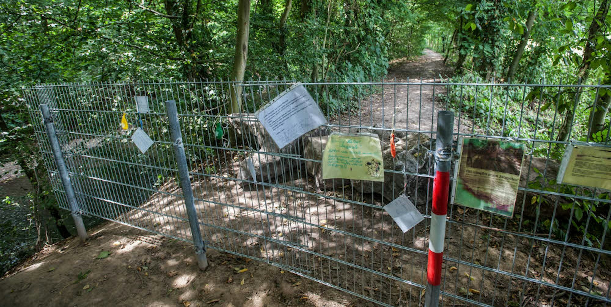 Das Absperrgitter auf dem Schlebuscher Dhünndeich hat sich mit zahlreichen Zetteln zu einer Art „Klagemauer“ entwickelt.