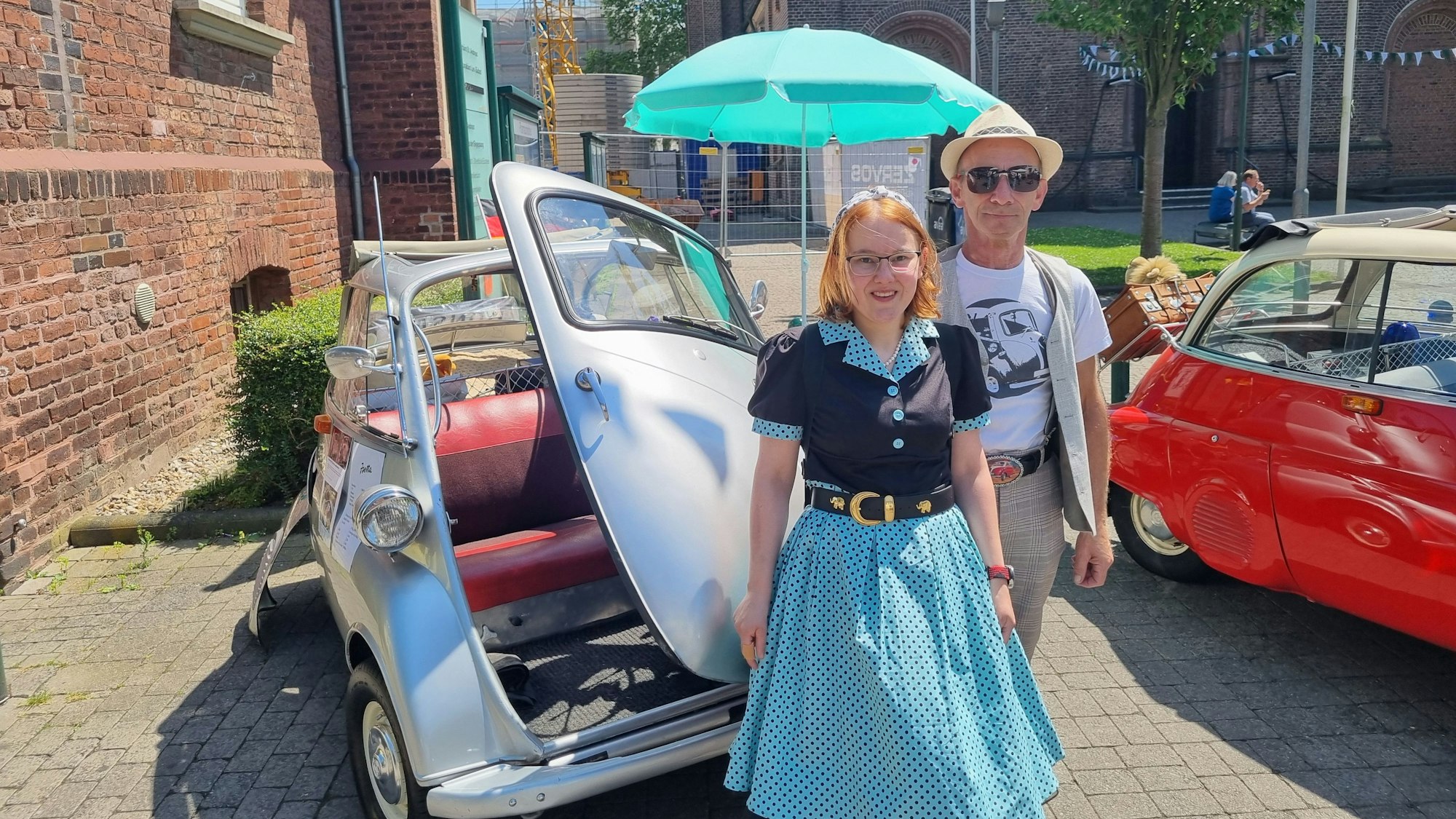 „Das sieht aus wie eine fahrende Badewanne“, kommentiert eine Besucherin eine alte Isetta. Thomas und Alexandra Conrad sehen das wohl anders. Sie sind mit ihrer Isetta in die Schlebuscher Fußgängerzone gekommen. Mit einem Eis in der Hand sitzen sie neben dem Auto unter einem Sonnenschirm. Sie sind nicht zum ersten Mal dabei. Sie kommen für den „Kontakt zwischen den Oldtimerfreunden“ und um „Kulturgut weiterzureichen“ erzählen sie. Seit fast 70 Jahren ist das Auto im Familienbesitz, im Sommer fahren sie auch bei schönem Wetter damit. „Alle auf der Straße grinsen und winken“, erzählt Alexandra.