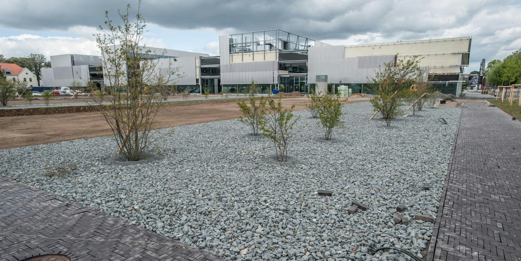 Tatsächlich sind auf dem Vorplatz des Gebäudes der Technischen Hochschule mehrere Abschnitte großflächig mit grauem Schotter belegt. Aus der Steinernen Decke ragen ein paar dünne Büsche. Bisher sind dort keine Bäume gesetzt worden.