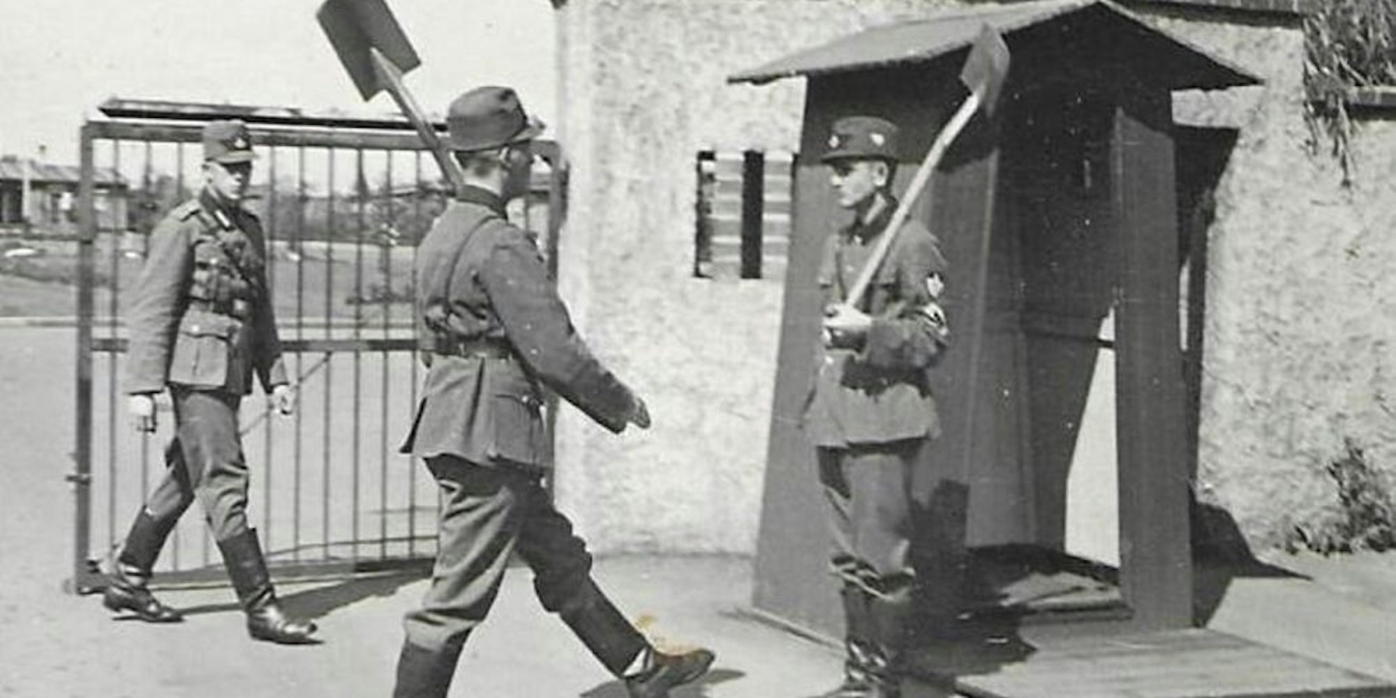 Wachablösung mit Paradespaten vor dem Eingangstor des Lagers mit Wachhäuschen