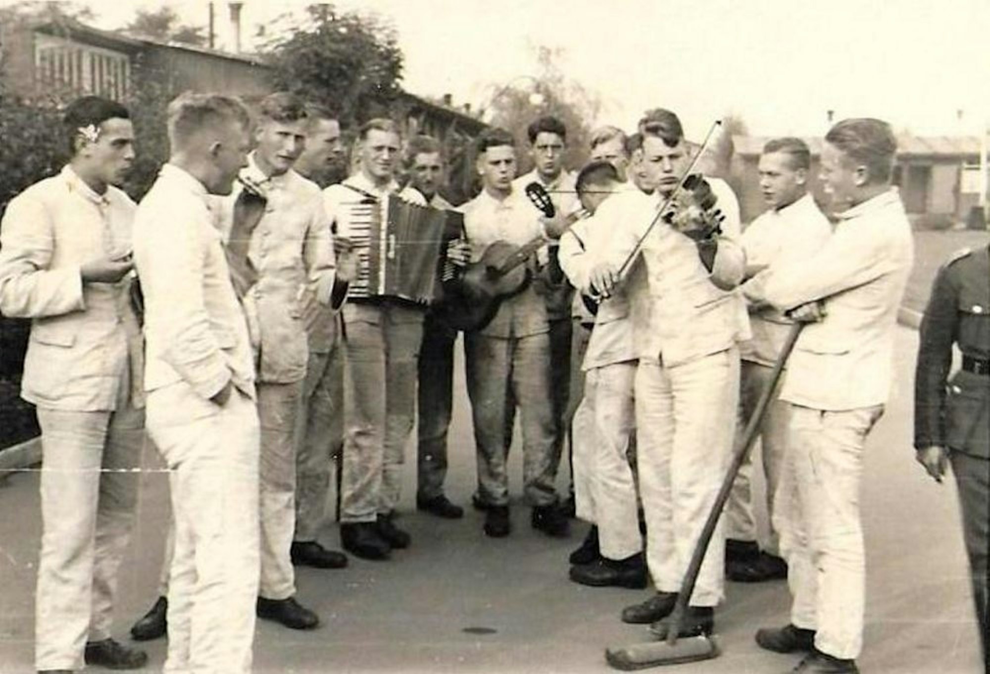 Das Ehrenmal des Manforter Steinmetzes Jakob Schramm wurde abgerissen. Nach Feierabend durfte der Arbeitertrupp mit seiner Lagerband musizieren. Das Foto entstand um 1940.