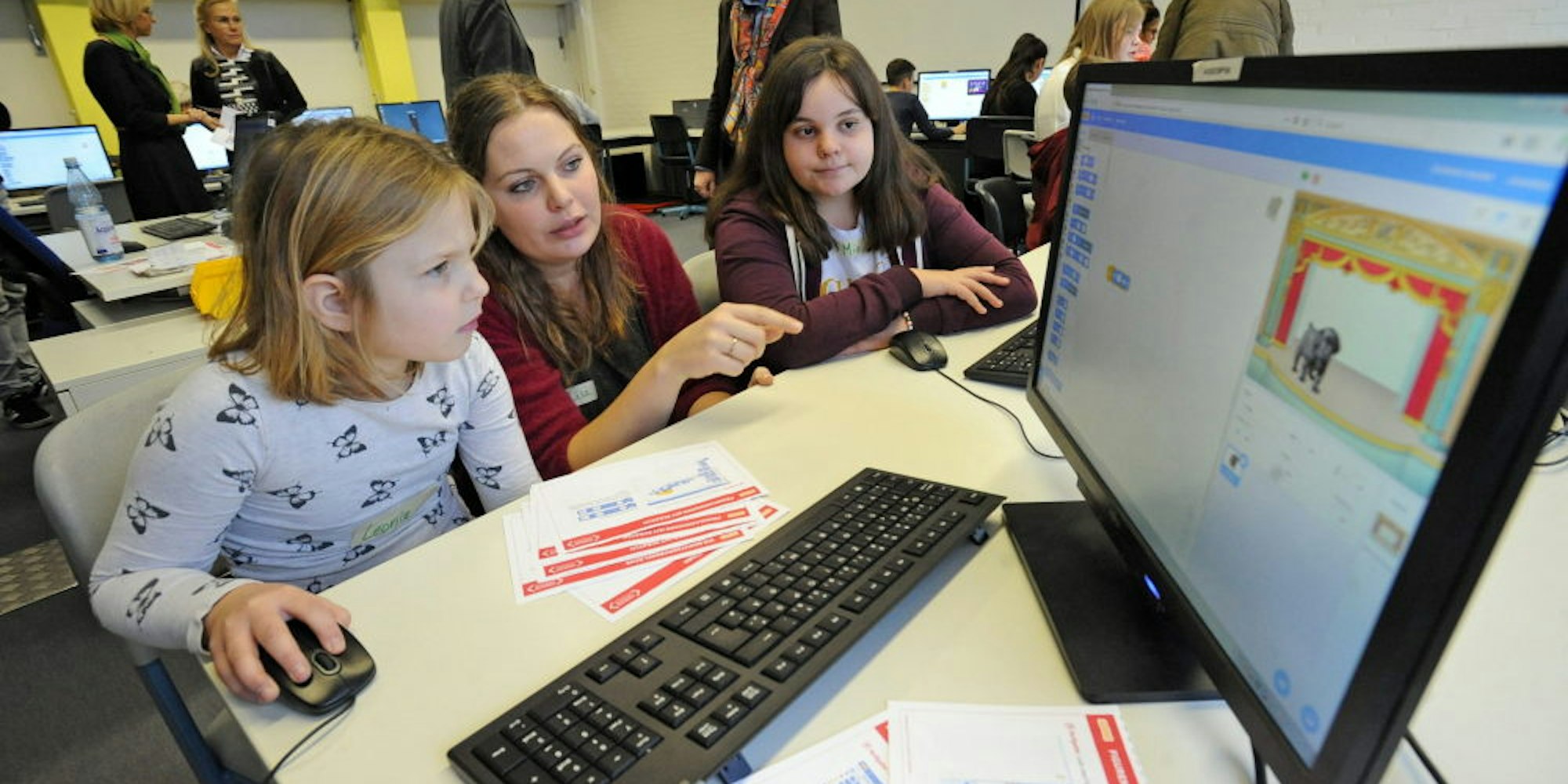 Leverkusen – Auf dem Bildschirm von Jason (12) hüpft eine wildgewordene Ballerina auf dem Mond herum. Ist das Absicht oder ein Programmierfehler? „Absicht!“, sagt Jason und tippt begeistert weiter auf bunte Felder, die die Programmierbefehle darstellen. „Das sieht cool aus.“ Mia tut sich schwerer. Sie versucht, eine Baseballspielerin zu einem Schlag zu bewegen. „Das ist ganz schön schwer“, sagt die Elfjährige, gibt aber nicht auf.