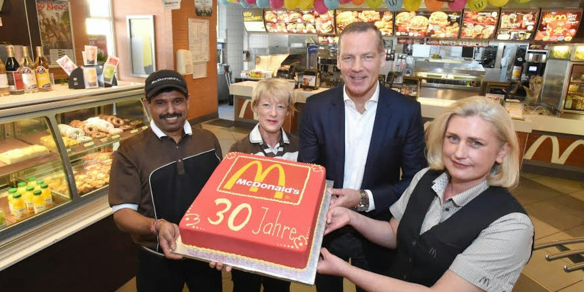 Leverkusen – Viel sportlichen Ehrgeiz hat der Ex-Profi-Boxer Henry Maske an den Tag gelegt, als es darum ging, ein großes Stück der Buttercremetorte zu verspeisen, die er zum Anlass des 30jährigen Jubiläums seiner McDonalds-Filiale in Opladen anfertigen ließ. „Ich hatte großen Appetit“, sagte er und aß seinen Teller leer.