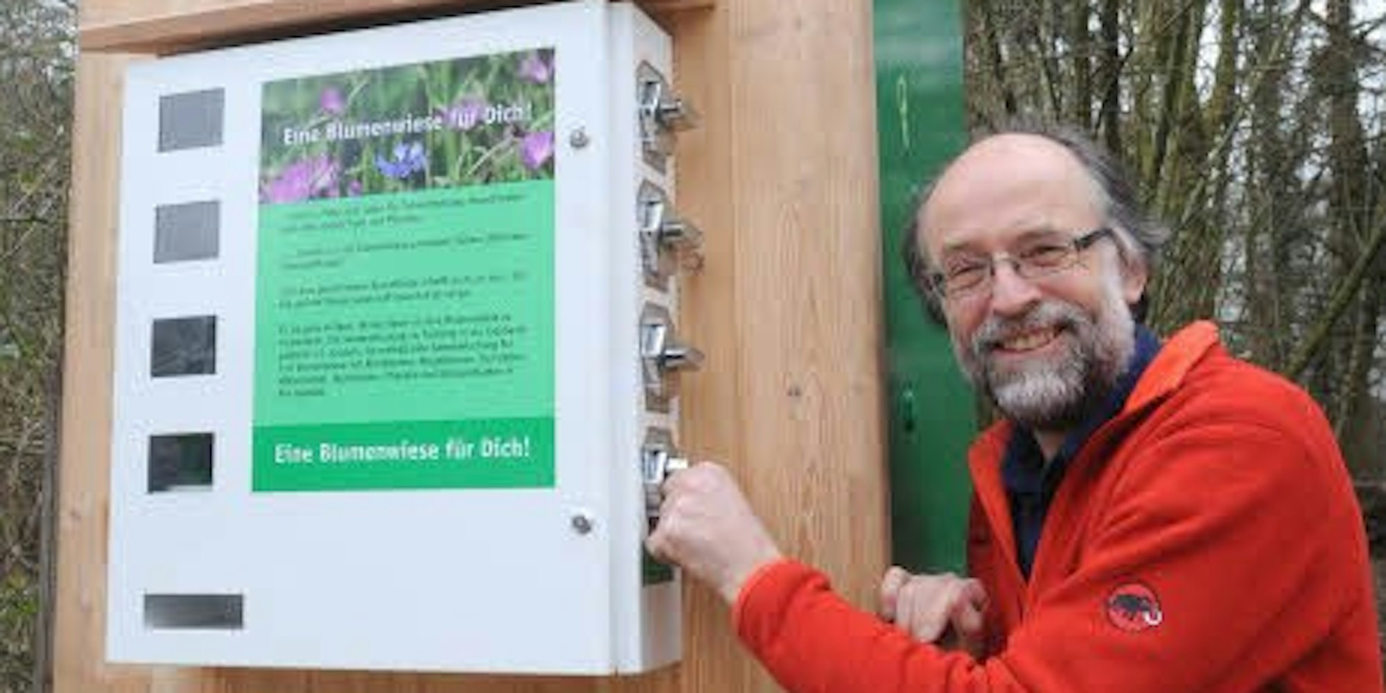 Das verriet jetzt Umweltpädagoge Hans-Martin Kochanek. Im Internet ist das Team des Naturguts auf den selten zu ergatternden Automaten gestoßen. Und es war laut Kochanek gar keine große Auswahl, es sei der einzige Automat dieser Art gewesen. Das Gerät wurde offenbar neu gespritzt, denn er ist jungfräulich weiß und ein kleines Plakat weist auf die Sache mit den Blumensamen hin. Über die eigentliche Bestimmung des Automaten, so wie er vom Hersteller ausgewiesen wurde, ist nichts zu erfahren.