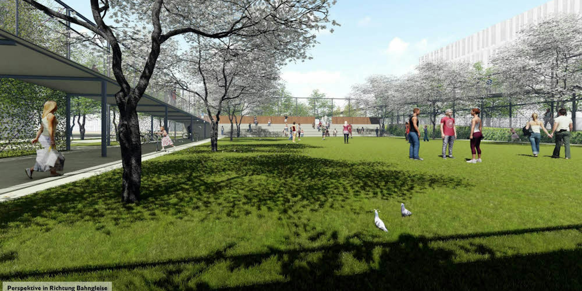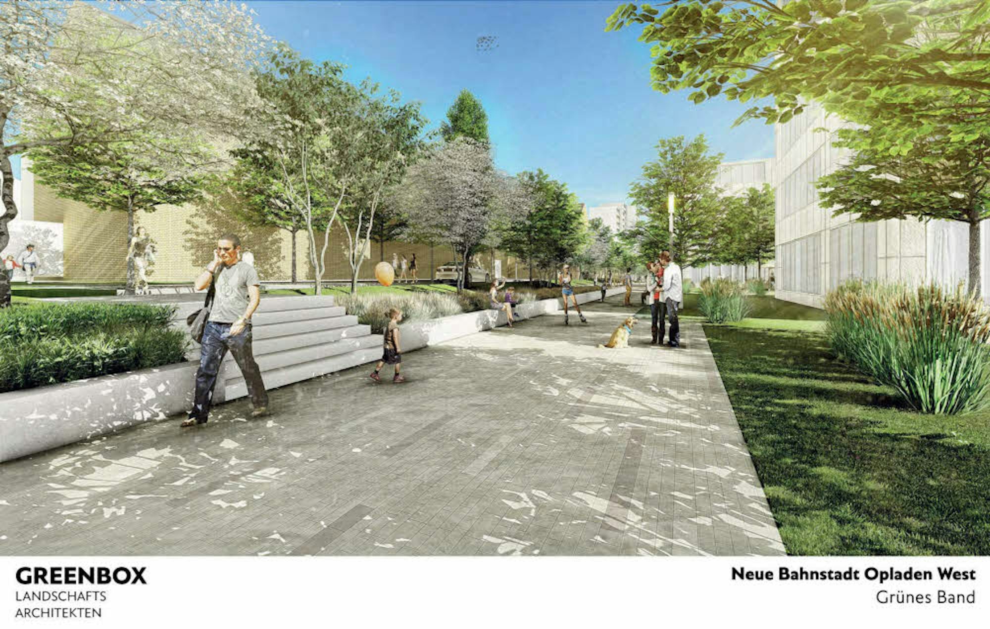 Während die künftige Europaallee längs der Schienen den Hauptverkehr am Opladener Zentrum vorbei aufnehmen soll, wird zwischen den bestehenden Bahnarbeiter-Häusern und den geplanten Neubauten ein Grünes Band in nord-südlicher Richtung das neue Wohngebiet mit einem Rad- und Gehweg erschließen. Entsprechend begrünt mit Bäumen und Sträuchern, wie der Name schon sagt. Und optisch erweitert durch die zur Westseite hin offenen Innenhöhe der Neubauten, die einen parkähnlichen Eindruck vermitteln sollen.