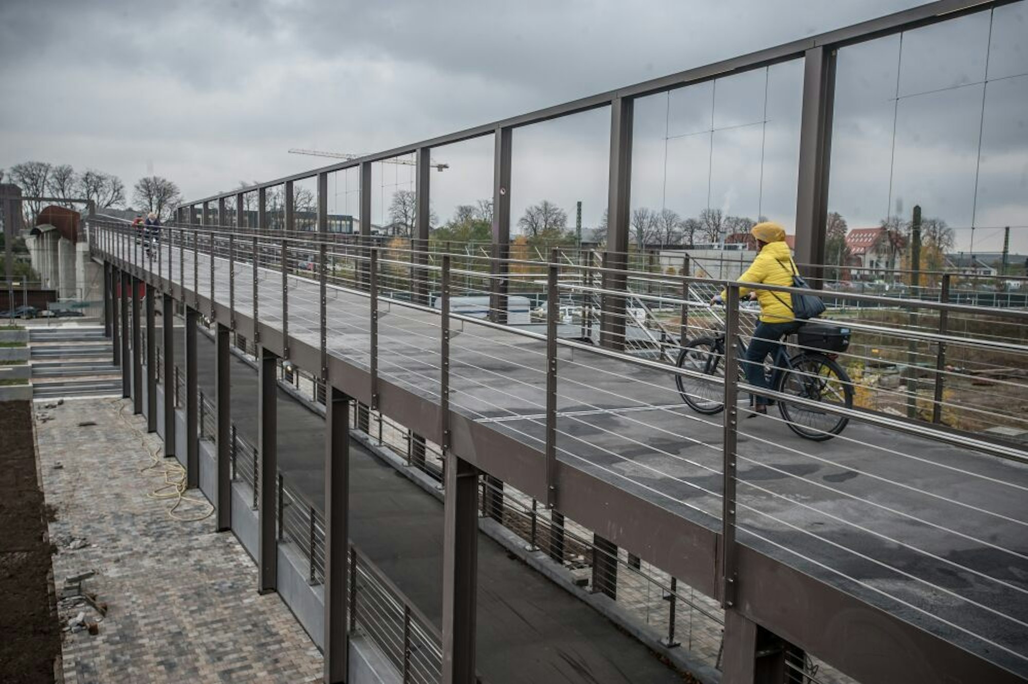 Die Rampe vom Busbahnhof hinauf zur Bahnhofsbrücke, in deren Innenraum ein Fahrradparkhaus mit über 400 Abstellplätzen entstehen wird, sollte ursprünglich einmal im Herbst 2020 fertig werden, nun erfolgte der Baustart erst im März 2021. Doch der Neubau der zunächst abgerissenen Rampe geht erkennbar nicht voran. Das liege vor allem am Stahlpreis und den gegenwärtigen Lieferengpässen bei diesem Baustoff, erläutert Bahnstadt-Geschäftsführer Andreas Schönfeld, der allerdings auch verspricht, dass es ab nächster Woche wieder vorangehen wird. Die Radfahrer-Rampe soll jedenfalls Ende des Monats wieder zur Benutzung freigegeben werden. An den Pläne für das Parkhaus selbst wird noch in den Planungsbüros gefeilt. Das kann noch dauern.