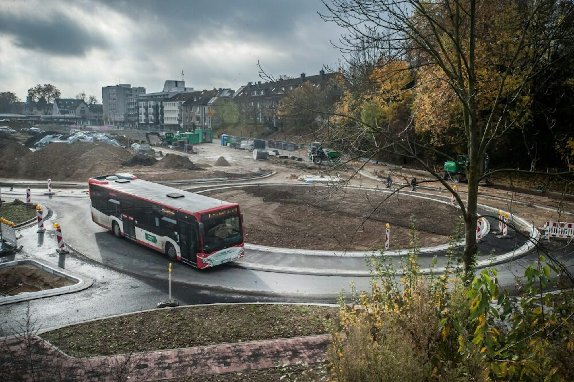 Dass es auch anders gehen kann, zeigt Schönfelds „Super-Baustelle“, der Kreisverkehr an der Einmündung Lützenkirchener Straße auf die Europaallee/ Freiherr-vom-Stein-Straße, am Nordende des künftigen Bahnhofsquartiers.