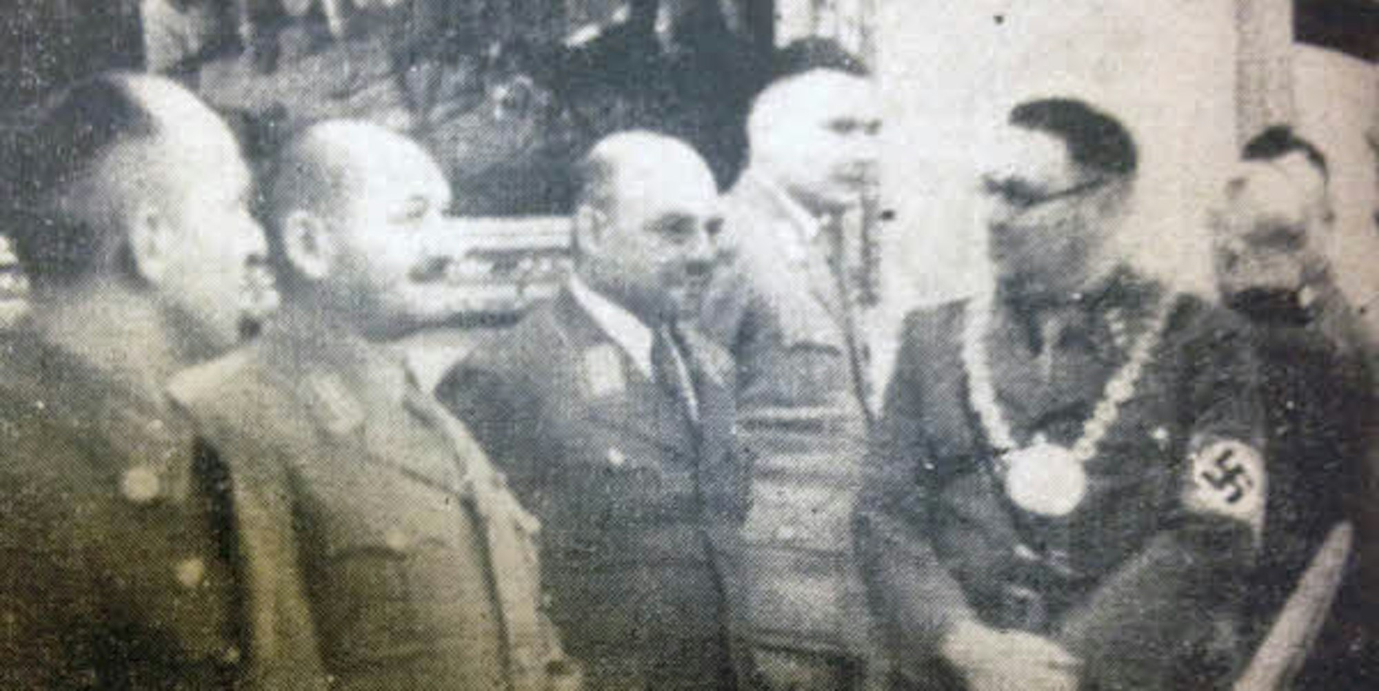 Otto Grimm (rechts) mit Hakenkreuzbinde und Amtskette als Bürgermeister von Altenburg im Kreise uniformierter Amtsträger der NS-Zeit.