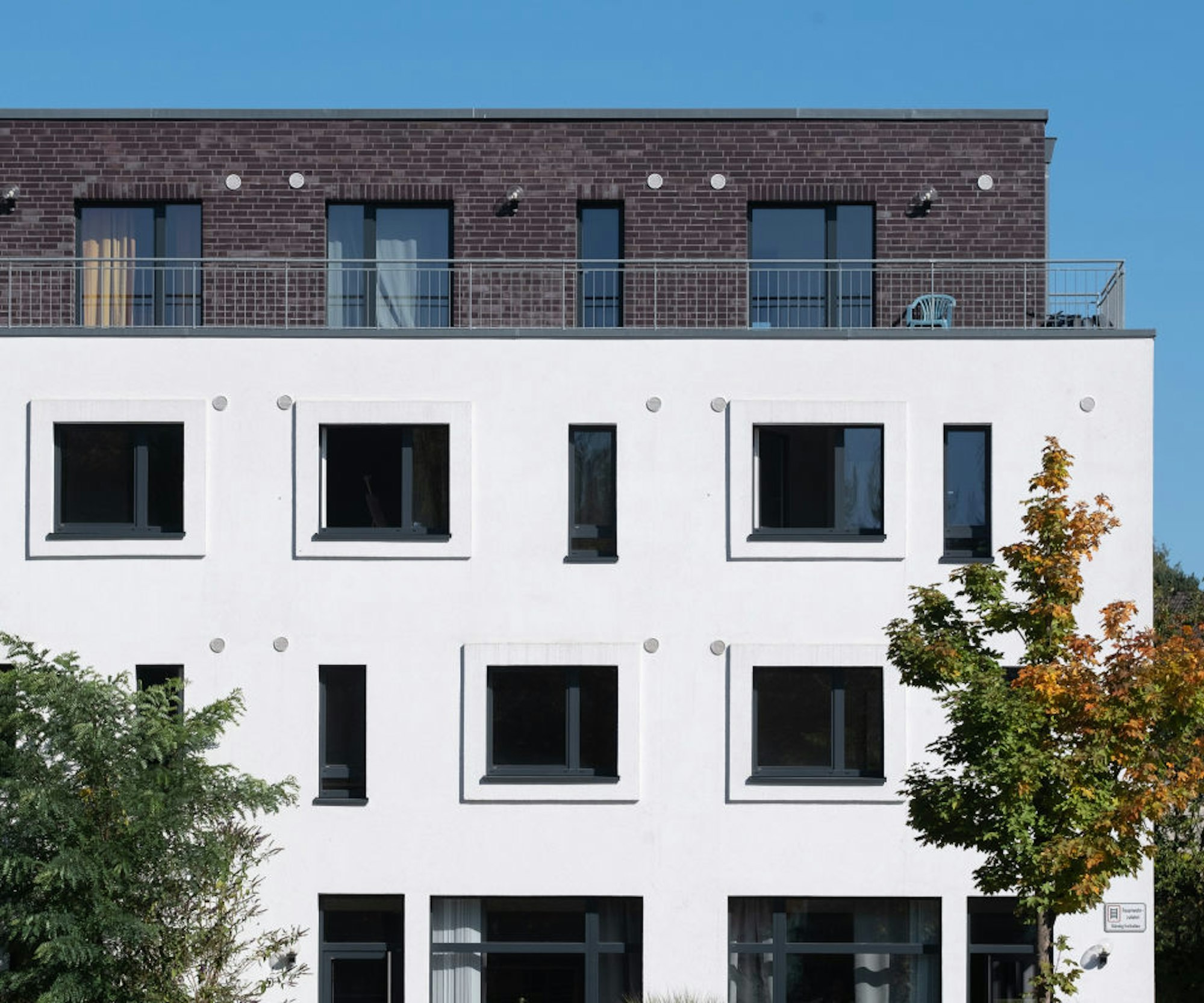 Für viele der Neubauten in der Bahnstadt gilt die rechtliche Vorgabe, den Klinkeranteil auf höchstens 20 Prozent zu beschränken. Klaus Küpper hat diese 20 Prozent als fotografisches Motiv gewählt – in unterschiedlichen Ausprägungen. Die hier abgebildete Darstellung entspricht dem Fotografen zufolge dem Baustil: „Diese Form der Architektur verlangt, sie so klar zu fokussieren.“ Küpper hat als „Kind der Wilhelmstraße“ – wie viele der Fotografen – den Wandel der Opladener Bahnstadt hautnah miterlebt. Bereits den Rückbau der alten Bahnanlagen hat er fotografisch ausführlich dokumentiert.