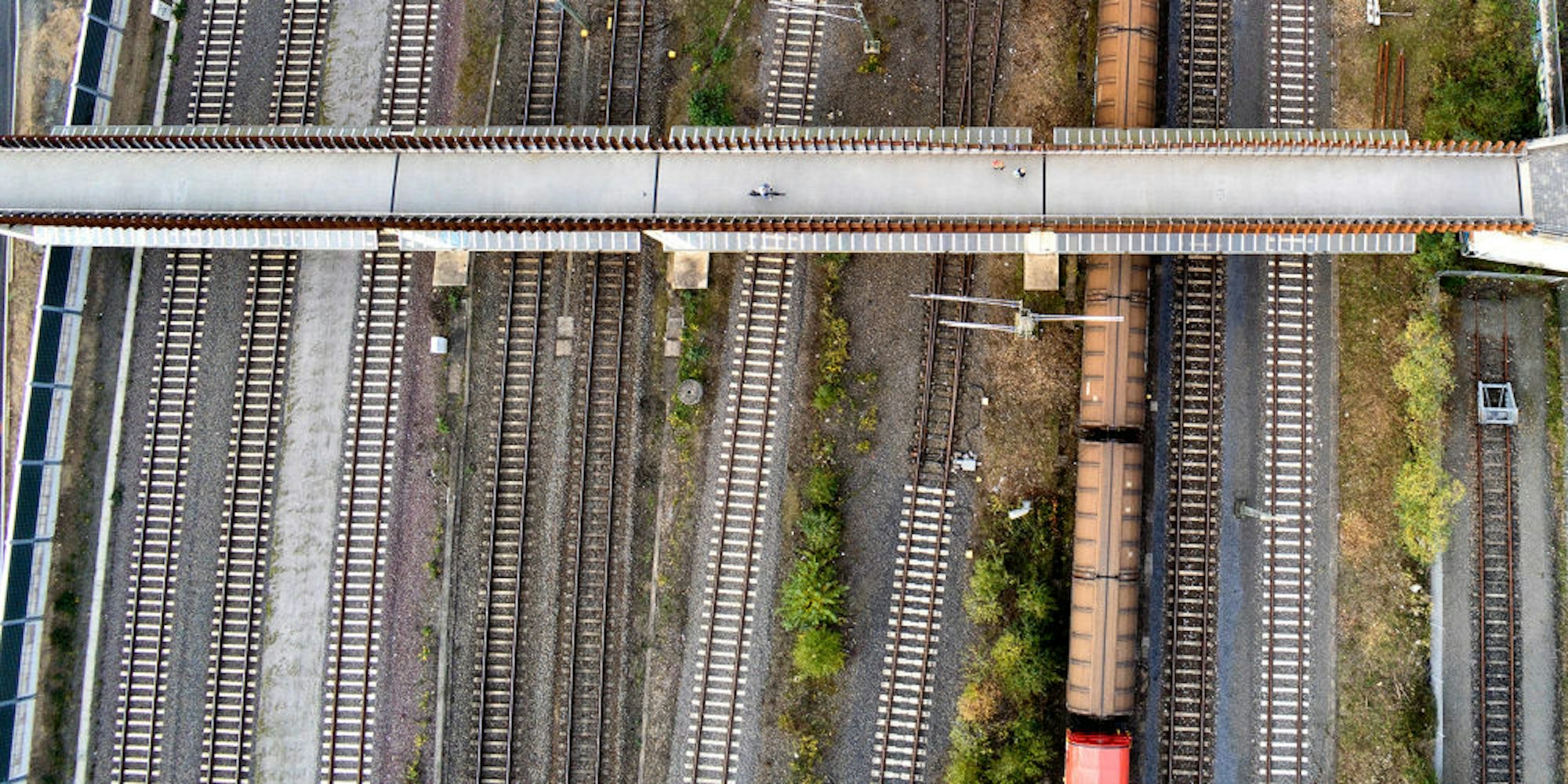 Walter Goralski hat die Bahnstadt mit Drohnen-Kameras von oben fotografiert, wie hier die Campusbrücke.