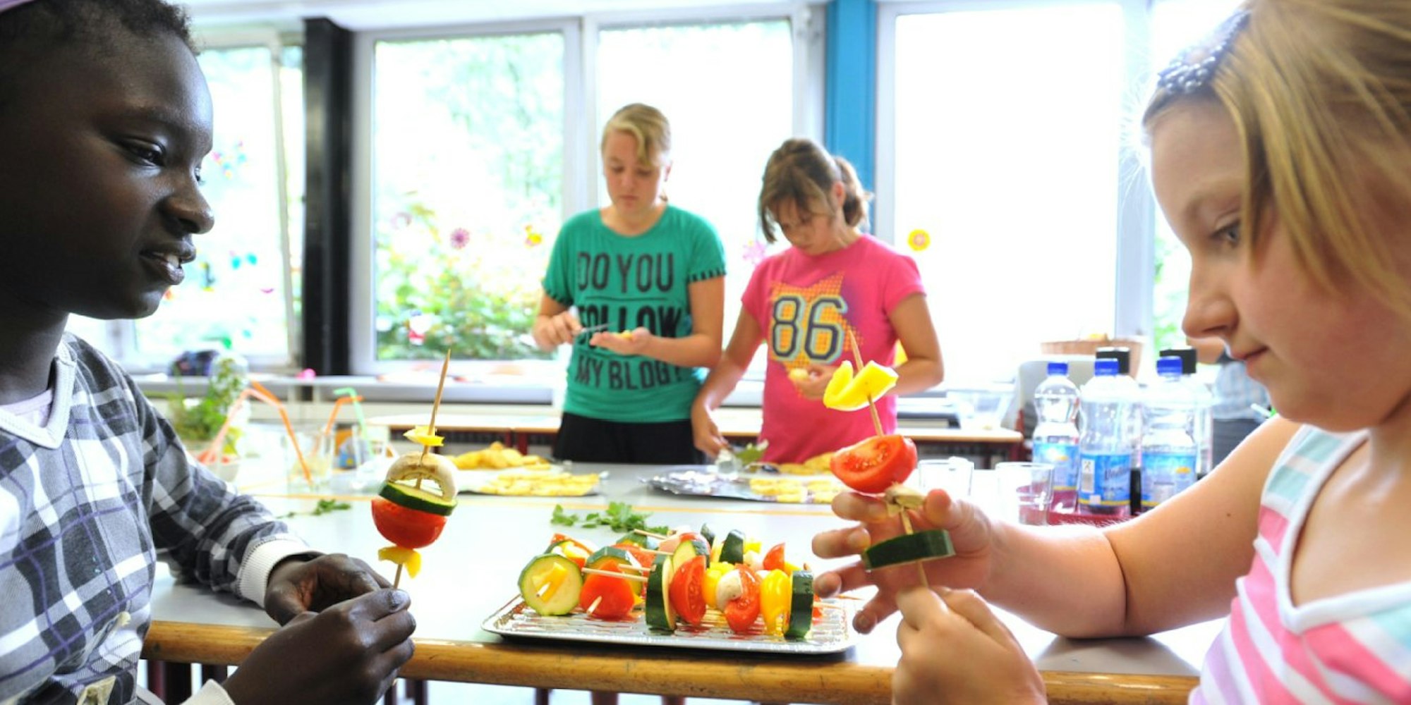 Sally (l.) und Marie vom Mädchentreff Mabuka in Quettingen bereiten ihre vegetarischen Grillspieße vor.