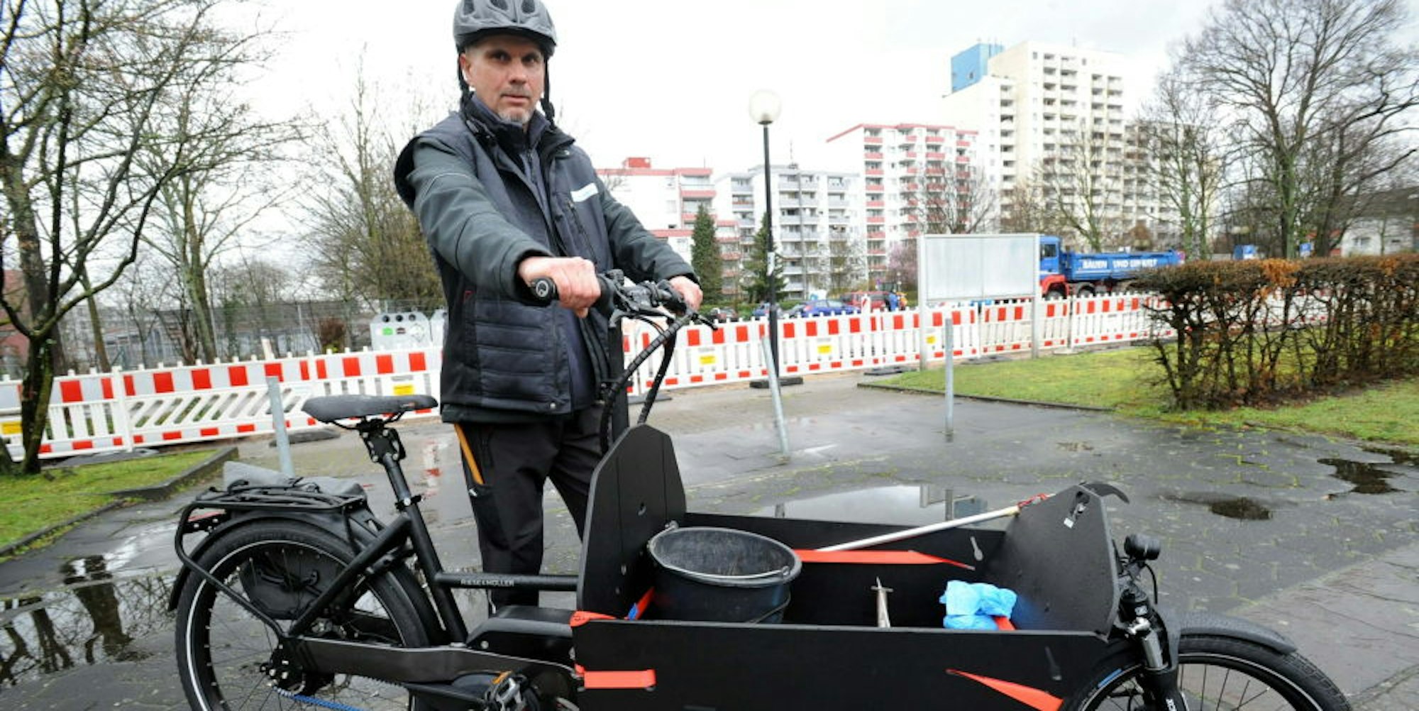 Mit dem Fahrrad fährt Adam Marek regelmäßig sein Quartier ab, räumt auf und dokumentiert Missstände.