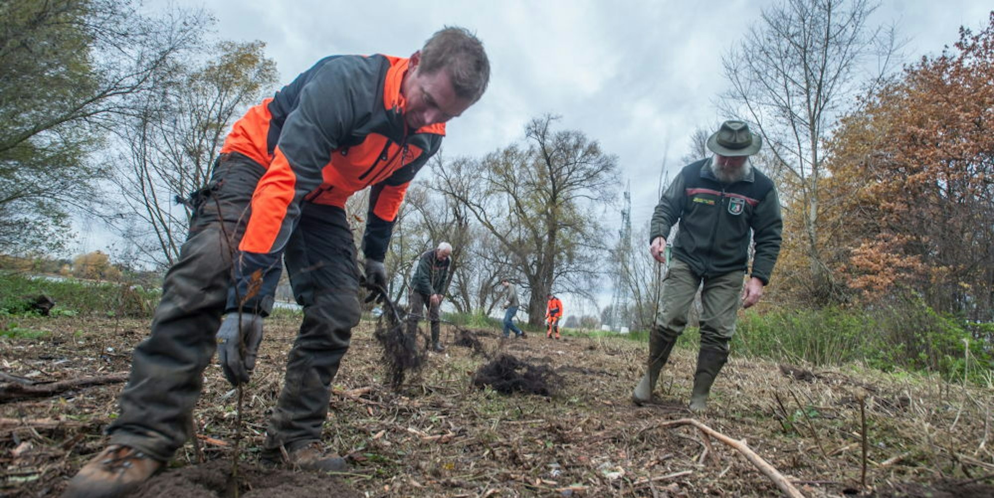 Gerrit Hochmuth, Kay Boenig und Karl Zimmermann (v.l.) pflanzen nahe der Schiffsbrücke Flatterulmen,