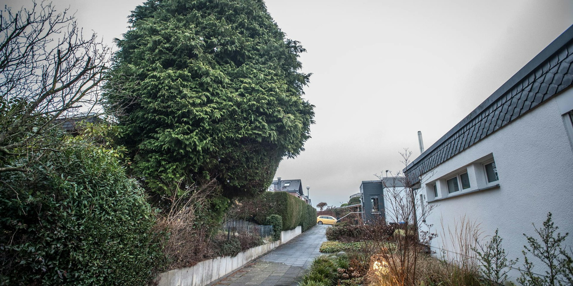 Acht gleiche Bungalows stehen nach heutigen Maßstäben gar nicht mal so dicht nebeneinander im Dreieck zwischen der Kandinskystraße, Paul-Klee-Straße und der kurzen Alfred-Kubin-Straße, die in einem Wendehammer endet. Zwischen dem Garten der Rotherts und dem Vorgarten des Nachbarn verläuft ein 3,30 Meter breiter Fußweg, ein Privatweg, der öffentlich nutzbar ist. Über den Weg ragen die Äste des Lebensbaums in drei Metern Höhe. Der Nachbar sei erst vor wenigen Jahren zugezogen, sagt Frau Rothert. Neulich habe er geklingelt und gefordert, dass der Baum weg müsse. „Aber der Baum kühlt im Sommer unseren Garten. Die Nachbarn wohnen ja im Süden, da macht der gar keinen Schatten. Wir haben das abgelehnt“. Außerdem lebten in ihm doch Vögel, habe sie dem Nachbarn gesagt – worauf der geantwortet habe, dass Vögel ihn nicht interessierten.