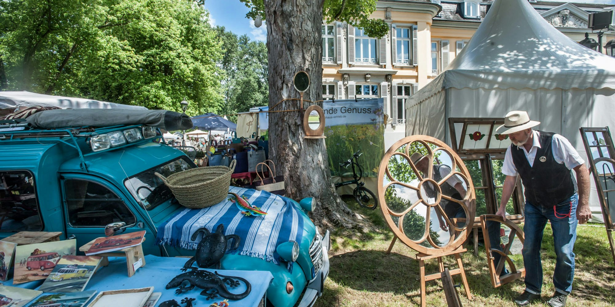 Bis Pfingstmontag lockt erstmalig die Landpartie in den Park von Schloss Morsbroich. 140 Aussteller mit Pflanzen, Schmuck, Mode, Möbeln und Dekorationen bieten ihre Waren feil – viele davon sind Unikate und aus eigener Herstellung.