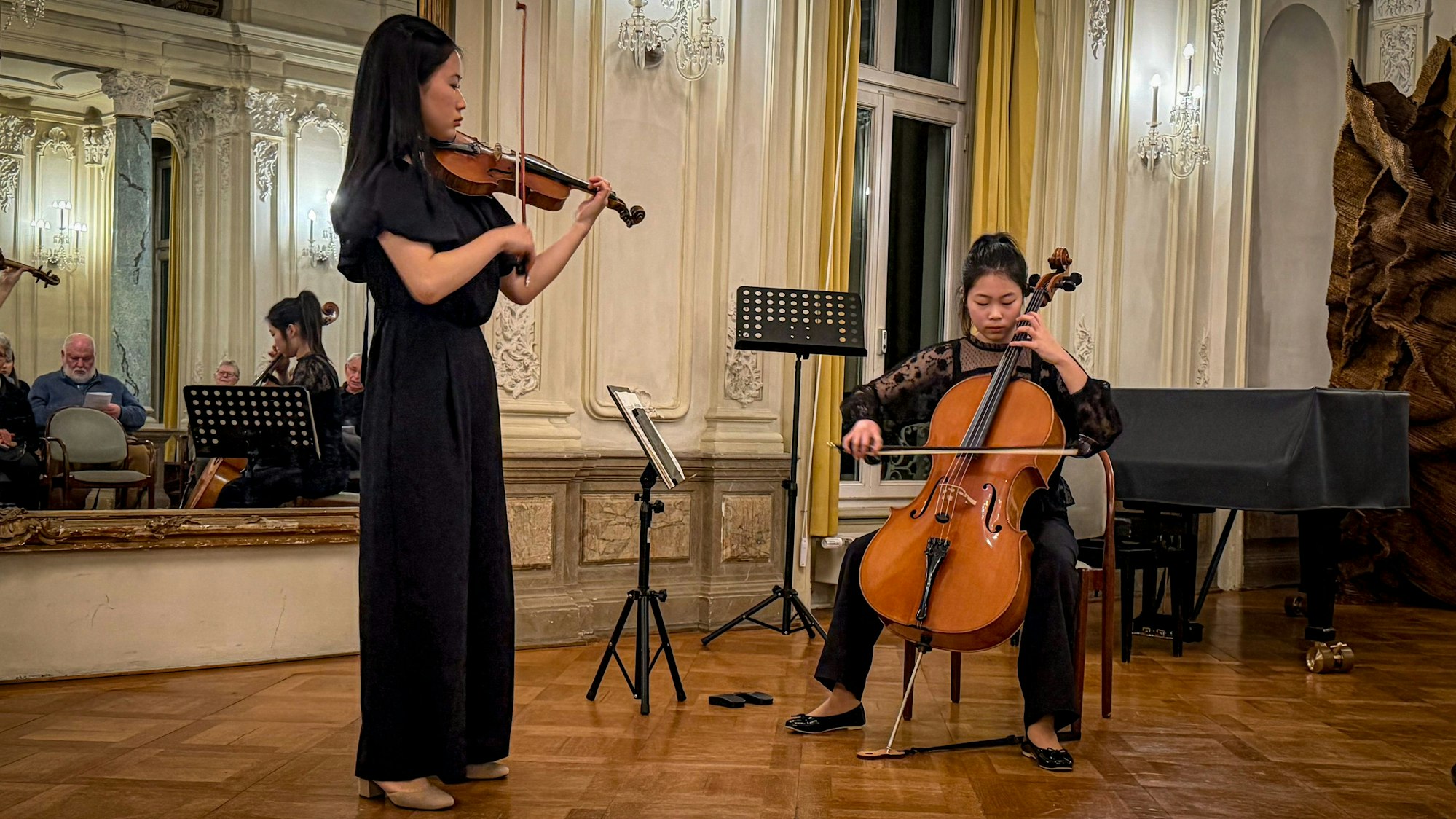 Erwin Schulhoffs Duo für Violine und Violoncello eröffnet mit herber Modernität, rhythmisch prägnant, als nervöser Dialog zweier gleichberechtigter Stimmen. Mit der Passacaglia in g-Moll von Georg Friedrich Händel in der virtuosen Bearbeitung Johan Halvorsens kippt die Spannung, passend zum Spiegelsaal, ins Barocke, Variationen schichten sich technisch wie emotional. Der Beginn bleibt dennoch zart: Nach der Anmoderation folgt Applaus – doch die Bühne bleibt leer, erst nachdem Thomanek nachsieht, erscheinen die ersten beiden Musikerinnen. Ein Moment jugendlicher Unsicherheit.