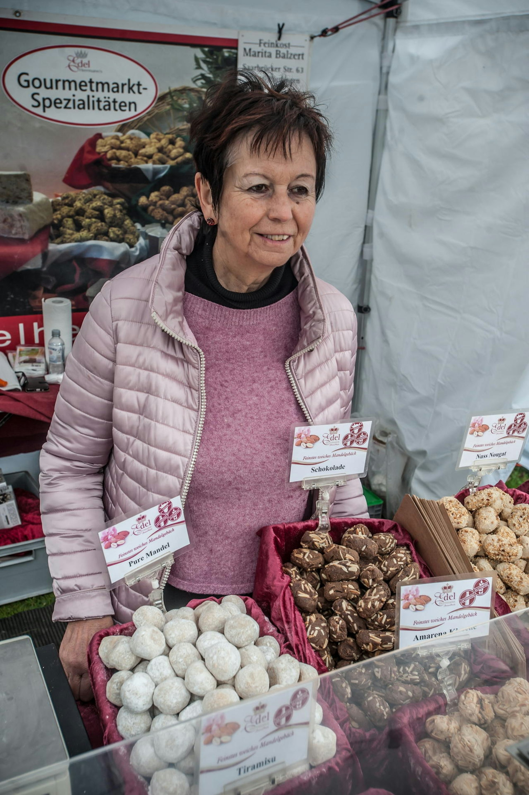 Schon zum Start am Freitagmittag ist der Markt gut besucht. Marita Balzert freut sich auf ein erfolgreiches Wochenende, zumal für Sonntag Sonnenschein angesagt ist. Sie verkauft Mandelgebäck in diversen Varianten bis hin zu einer schwarzen Vanille-Cranberry-Kreation.