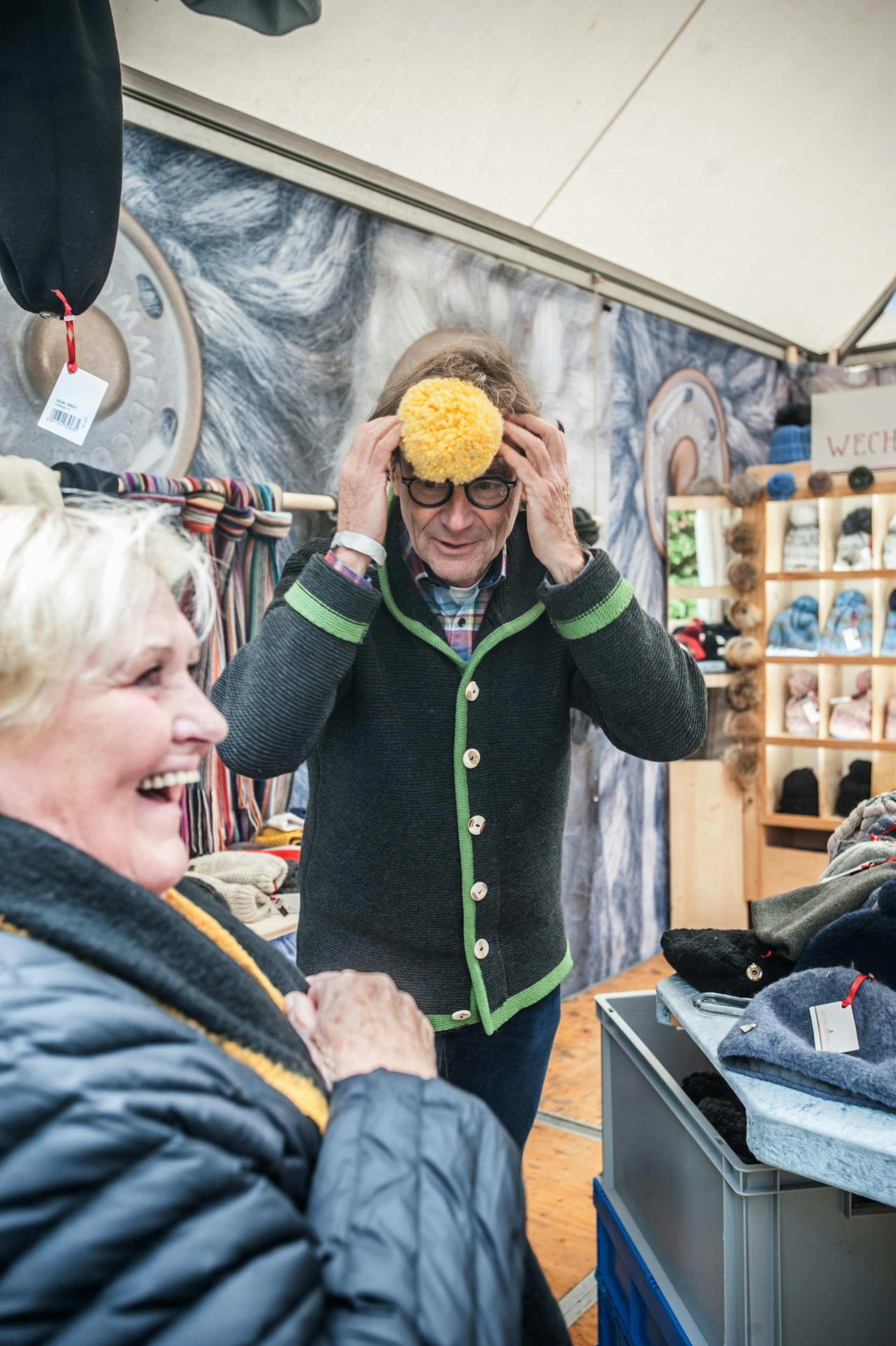 „Wechselbommel“ heißt sein Laden und der Name ist Programm: Alle Mützen sind mit einem Druckknopf versehen, die Bommel können nach Lust, Laune und Jackenfarbe ausgetauscht werden. Auch Echtfellbommel sind dabei. „Da stehe ich dazu“, sagt Hübner. „Das Fell kommt vom deutschen Jagdverband und ist von Füchsen, die geschossen werden mussten, es ist somit eine nachhaltige Verwertung.“