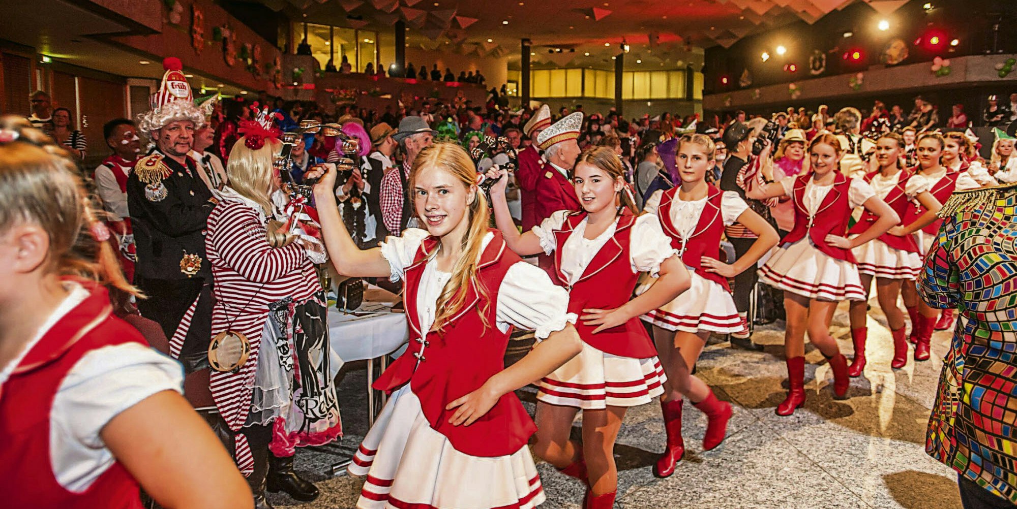 Der Elferrat hat auf der Bühne Platz genommen, „das sind die elf Pappnasen, die da oben sitzen“, erklärt Kommandant Oliver Höhne. „Die Stimmung ist wirklich bombastisch.“ Vor dem Elferrat glitzert nun das Grün-Weiße Tanzkorps Die Schlebuscher wie Weihnachtsbäume auf der Bühne. Die Mariechen werden heute extra hoch geworfen und gehoben, während die Tanzenden ihre beeindruckenden Choreographien zeigen.