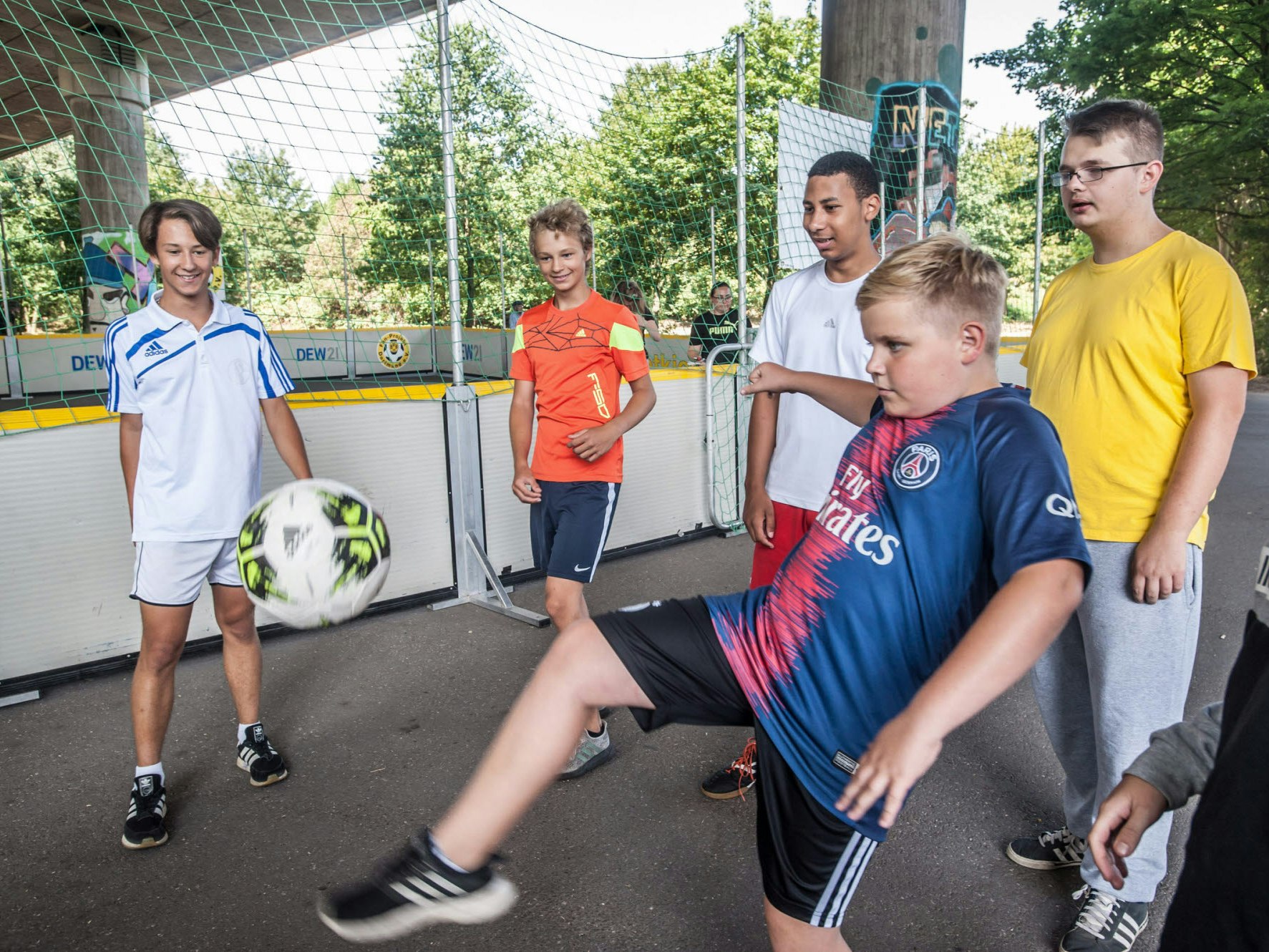 Im Schatten der Autobahnbrücke wurde ein kleines Fußballfeld errichtet, in einem Turnier kämpfen acht Mannschaften gegeneinander um große silberne Pokale. Mädchen und Jungen jeden Alters spielen gemischt, vier gegen vier. Ihre Freunde feuern vom Spielfeldrand an. Stefan Thomé vom „Fanprojekt Leverkusen“ steht auf einem der Skater-Hügel und verfolgt das Spiel lächelnd. Zum fünften Mal ist der Verein bei der Ferienfreizeit dabei. Ein Teil der sozialen Arbeit, die der Verein mit Fans betreibt.