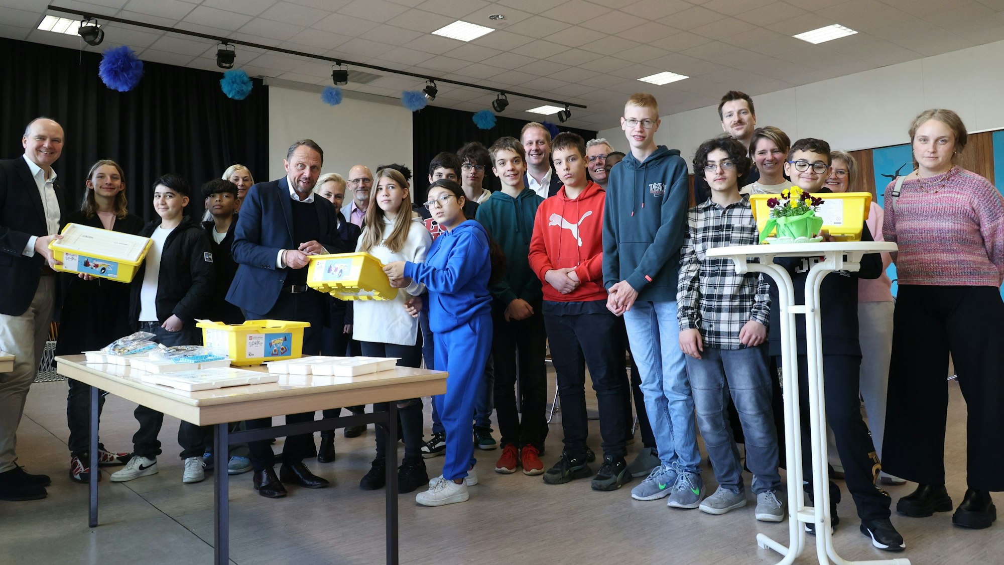 Gemeinsam mit Oberbürgermeister Uwe Richrath übergab Koch der Schule fünf brandneue „Lego Spike Prime Roboter-Sets“. Diese Sets ermöglichen es den Lehrern für Informatik und Technik, ihre Schülerinnen und Schüler an das Programmieren und an die Robotik heranzuführen und für den landesweit veranstalteten zdi-Roboterwettbewerb zu trainieren.