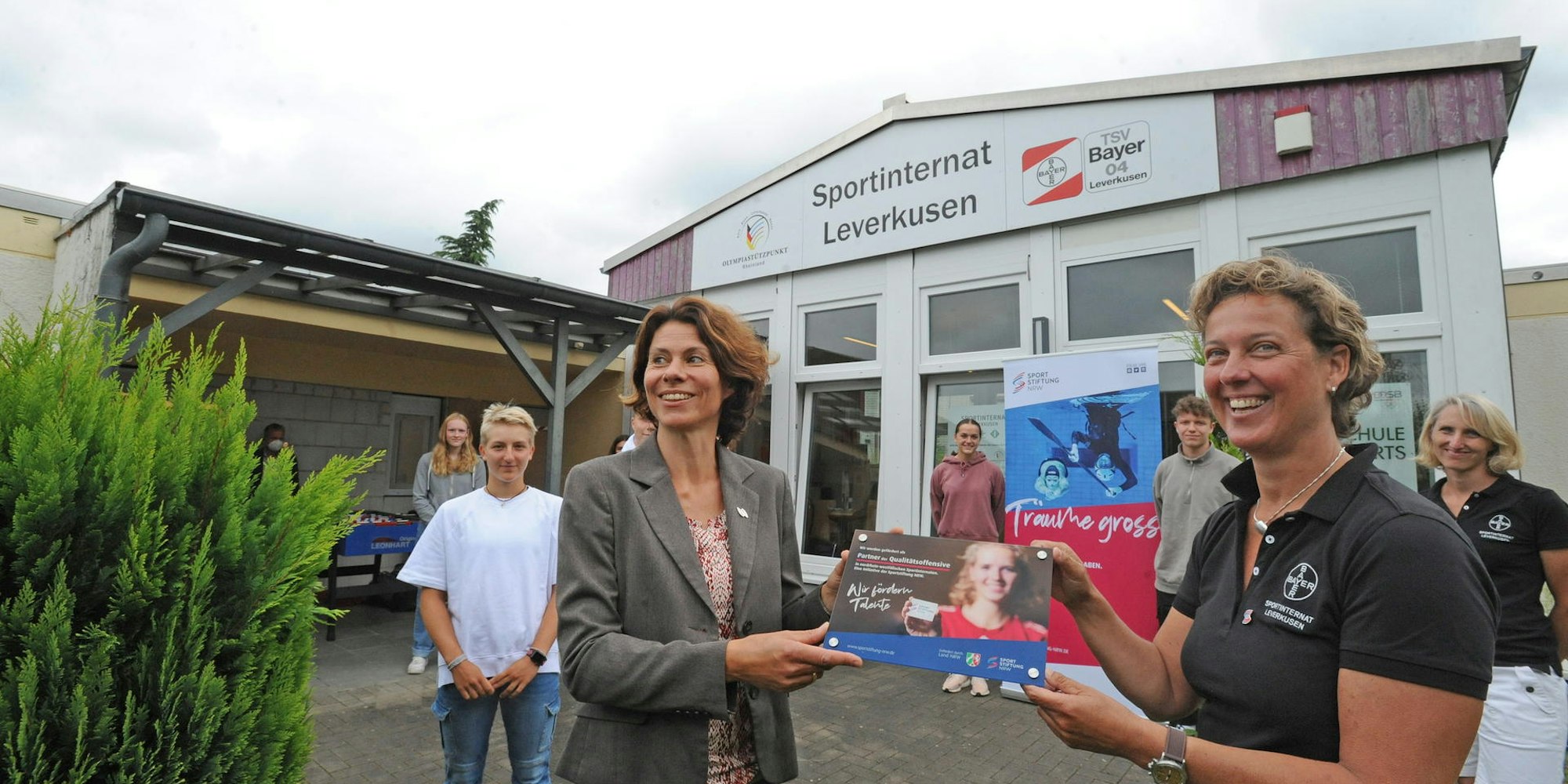 Leverkusen – Der erste Schultag ist erst am Mittwoch. Doch für 29 sportliche junge Menschen begann schon am Montag ein neuer Abschnitt in ihrem Leben: Sie hatten ihren ersten Tag am Sportinternat Leverkusen. Das sie hier in eine ausgezeichnete Einrichtung kommen, demonstrierte die Sportstiftung NRW direkt vor dem Mittagessen. Denn hier trafen sich zwei ehemalige Weltklasse-Leichtathletinnen vor der Tür: Anke Feller (Weltmeisterin 1997 mit der 4x400-Meter-Staffel) übergab in ihrer Funktion als stellvertretende Vorstandsvorsitzende der Sportstiftung eine Plakette an die ehemalige Speerwurf-Weltmeisterin Steffi Nerius, die das Sportinternat leitet.
