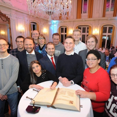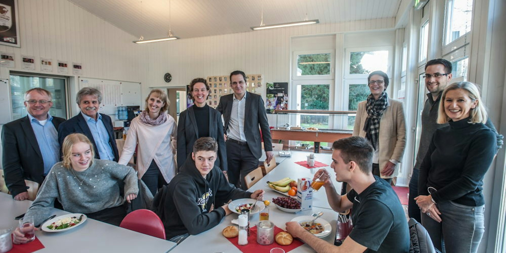 Besuch bei der Elite des Sports: Rüdiger Scholz (l), Internatsleiterin Steffi Nerius (4.v.l), Jens-Peter Nettekoven (5.v.l) und Jutta Wellmann (r) treffen Volleyballerin Finja Schul, Fußballer Felix Stoffler und 400-Meter-Läufer Dani Khulusi (vorne von links).