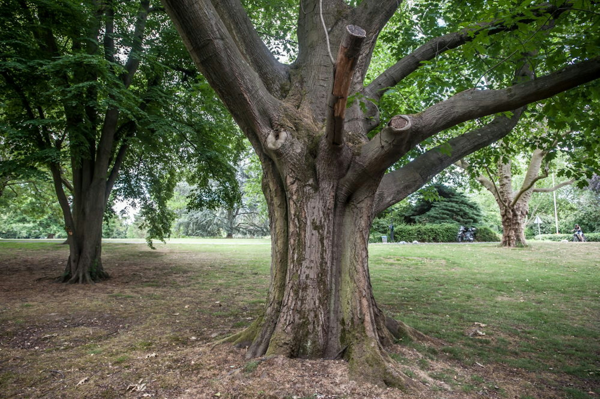 In der zwölfköpfigen Radfahrergruppe geht es unter dem schwergrünen Blätterdach über weiche Erdwege. Zwischen dem Carl-Duisberg-Park und dem Casino gab es früher einen Tenniscourt. Auch andere gehobene Sportarten wie Rudern und Hockey wurden betrieben. Die Grenze zwischen Leverkusen und Köln ging damals mitten durch den Park. Später wurde gegenüber des Casinos zu Ehren Carl Duisbergs und seiner Frau Johanna eine Grabstätte errichtet. Am weißen Floratempel hört man den Verkehr plötzlich nicht mehr, nur wildes Vogelgezwitscher ertönt zwischen den schlanken Jugendstilfiguren.