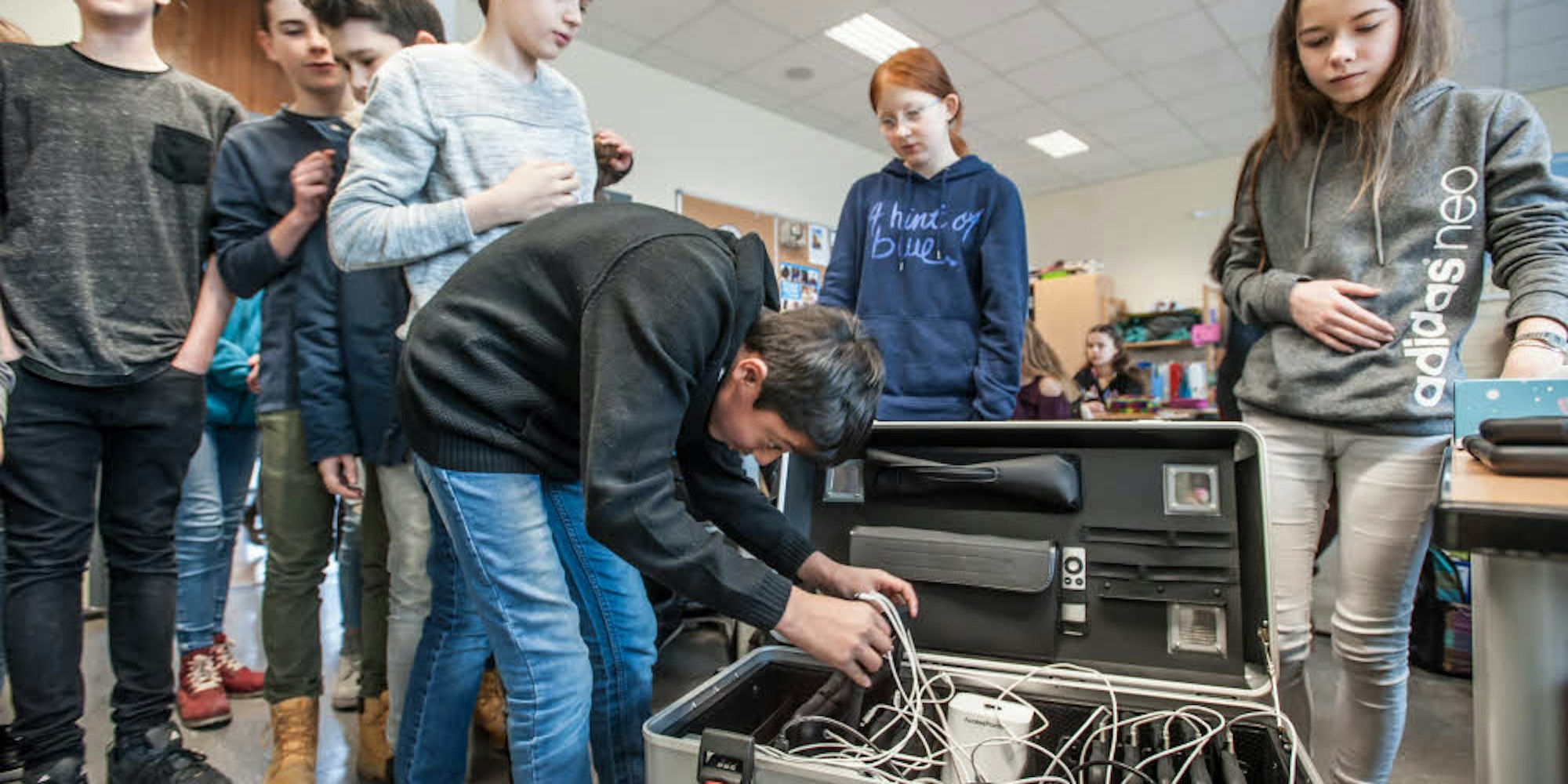 iPad-Ausgabe im Klassenraum: Drei solcher Koffer mit je 18 iPads stehen den Schülern des Opladener Landrat-Lucas-Gymnasiums seit Anfang Dezember im Unterricht zur Verfügung. Zahlreiche Klassen machen von dem Angebot bereits regelmäßigen Gebrauch.
