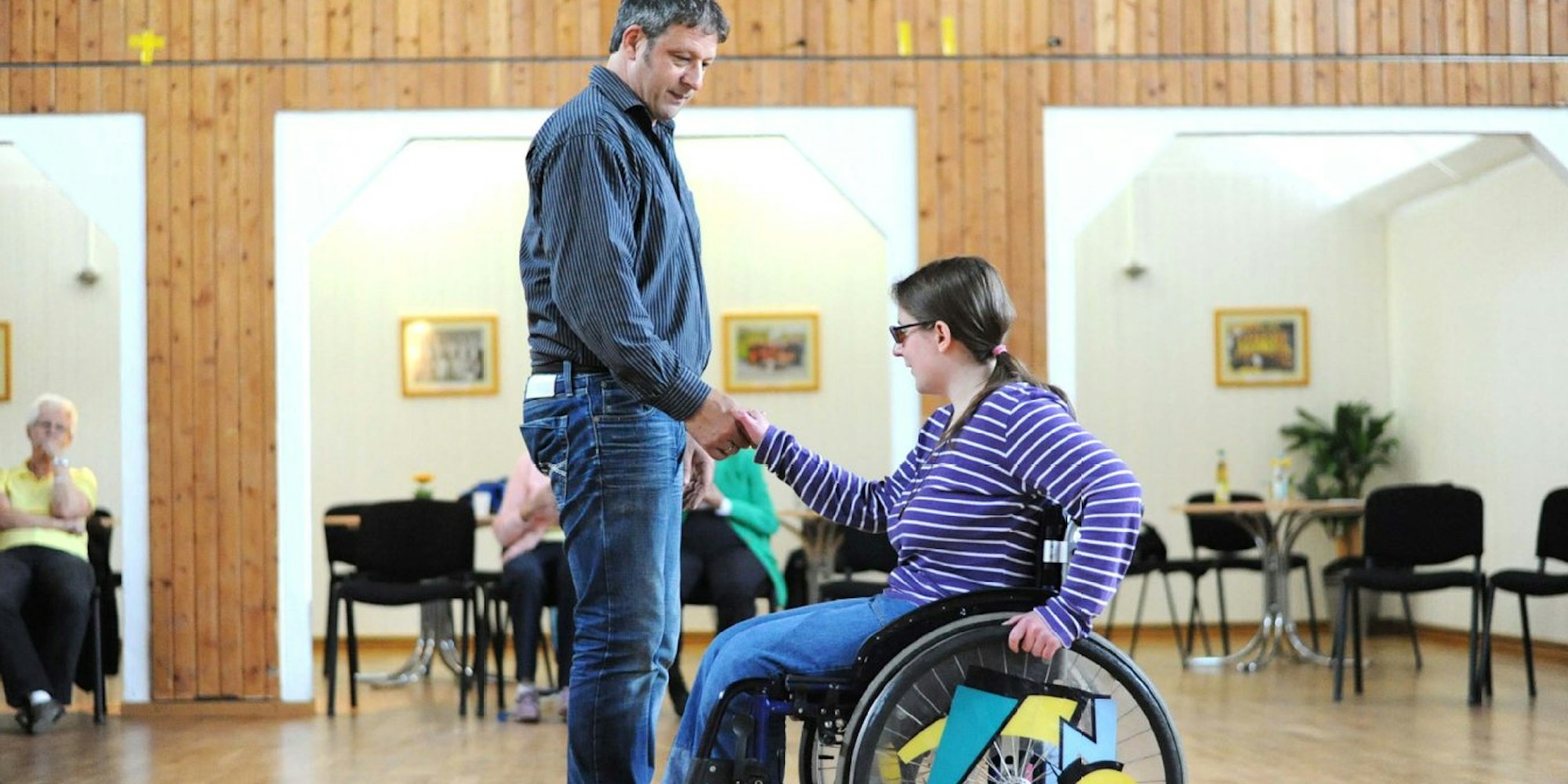 Rollifahrerin Lisa Pohlig probiert das Tanzen zum ersten Mal aus, Lehrer Udo Dumbeck zeigt seiner Partnerin die Figuren.