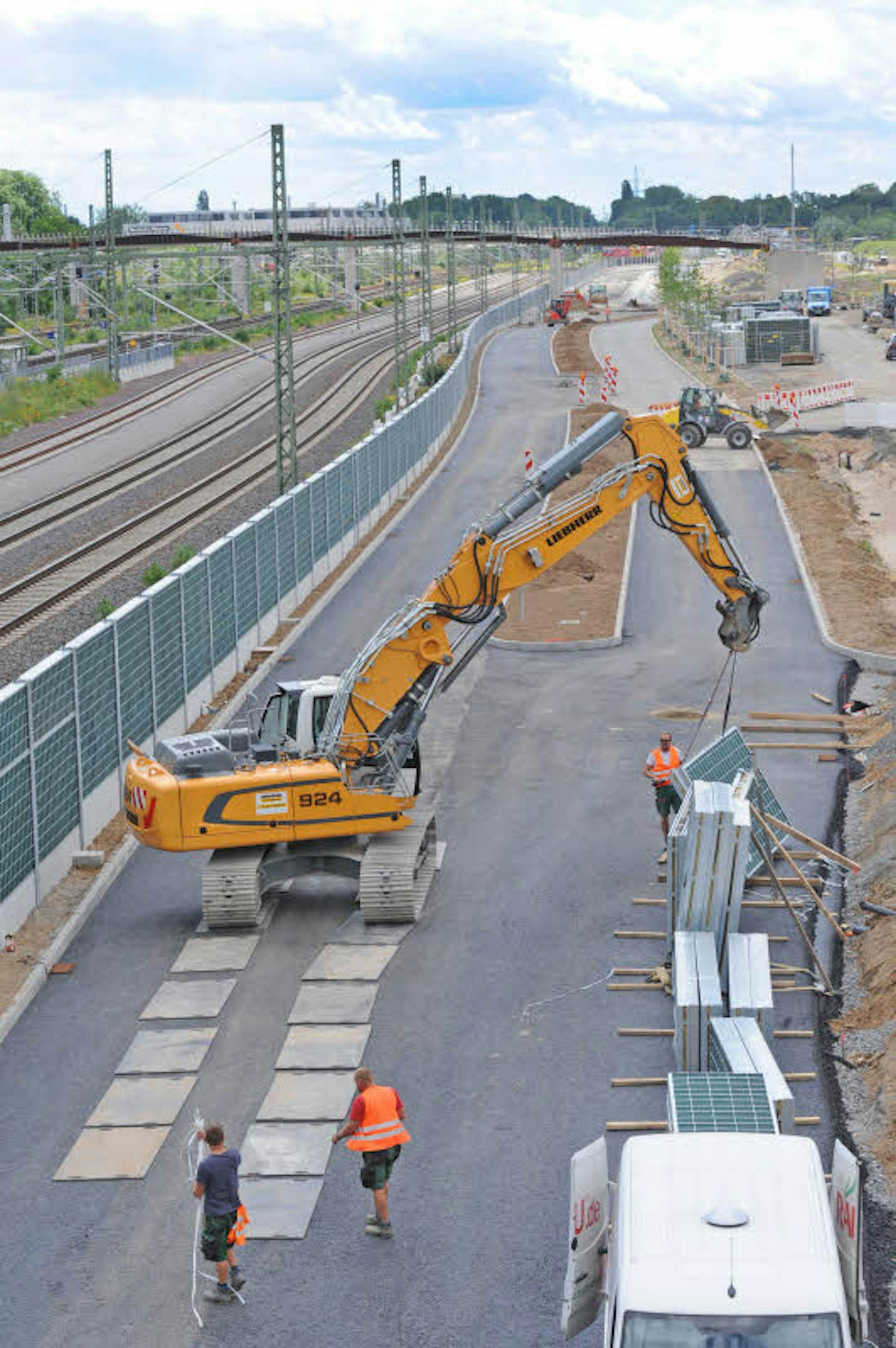 Die Europa-Allee erschließt auch die Westseite der Neuen Bahnstadt. Dort werden weitere Häuser entstehen. Eine Wand schirmt den Bereich schon jetzt vom Bahnlärm ab. Außerdem werden weitere Sumpfeichen gepflanzt. Die Bäume sollen schnell wachsen. (tk)